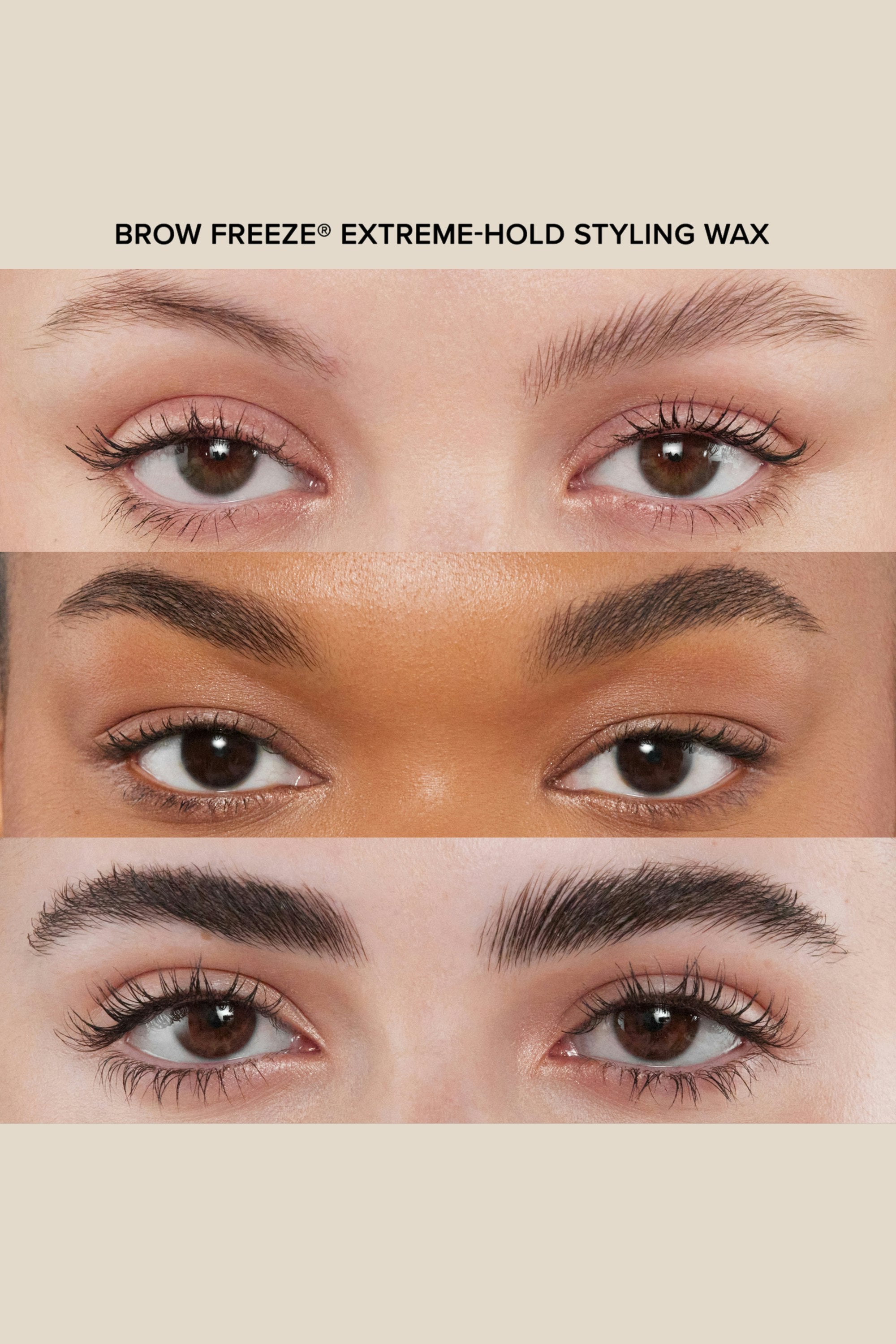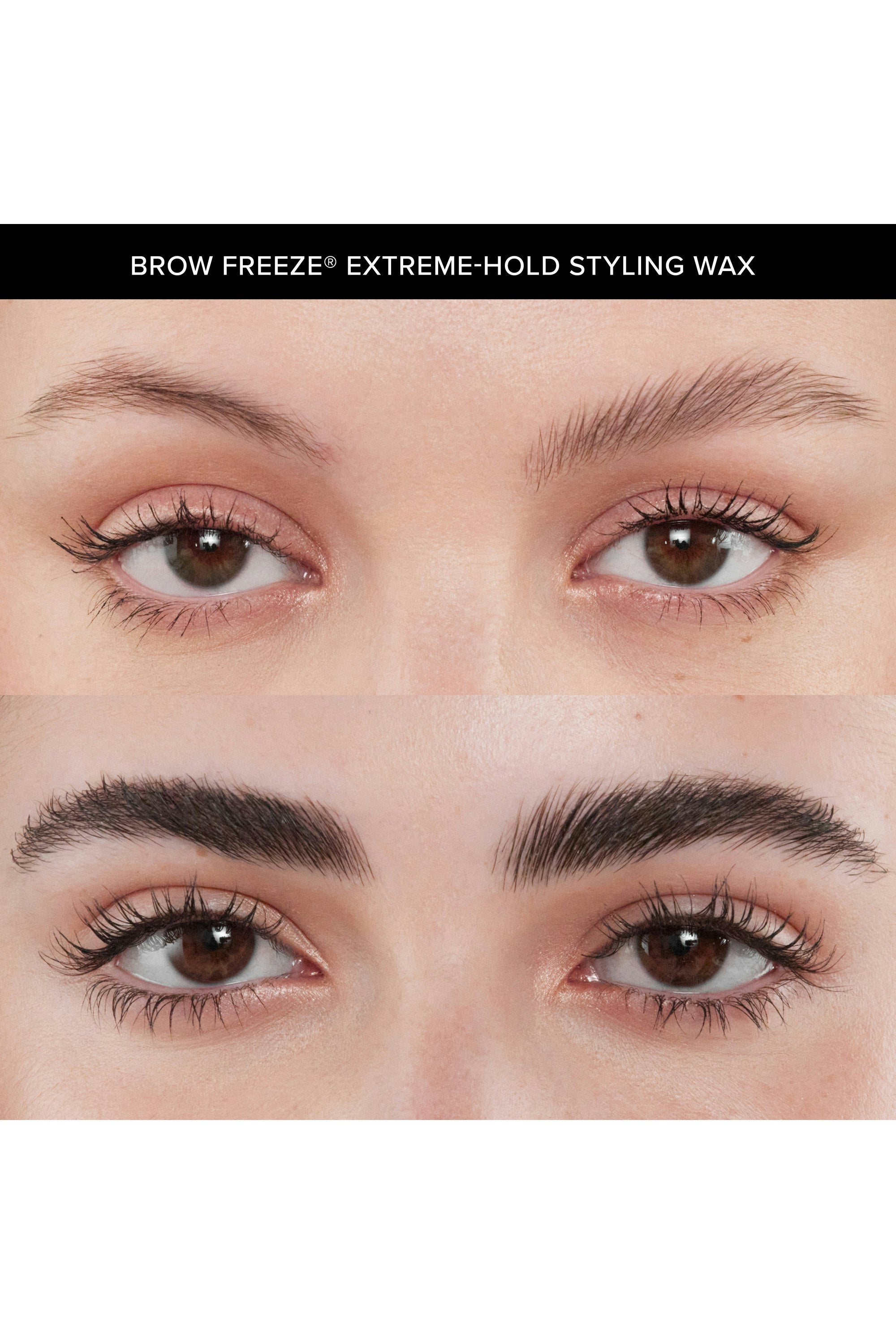Anastasia Beverly Hills Brow Freeze introduces our strongest brow hold yet! This customizable brow styling wax lifts, tames and sculpts every hair in place for the feathered-looking brow you've always wanted. The universal, easy-to-apply formula is mess-free and provides long-lasting, extreme-hold leaving you with full-bodied brows that last all day. Using the back of the cap, work the product back and forth. On clean brows, brush through the brow using upward motions and gently pressing down as you go. Continuously brush them in the desired direction as it sets.