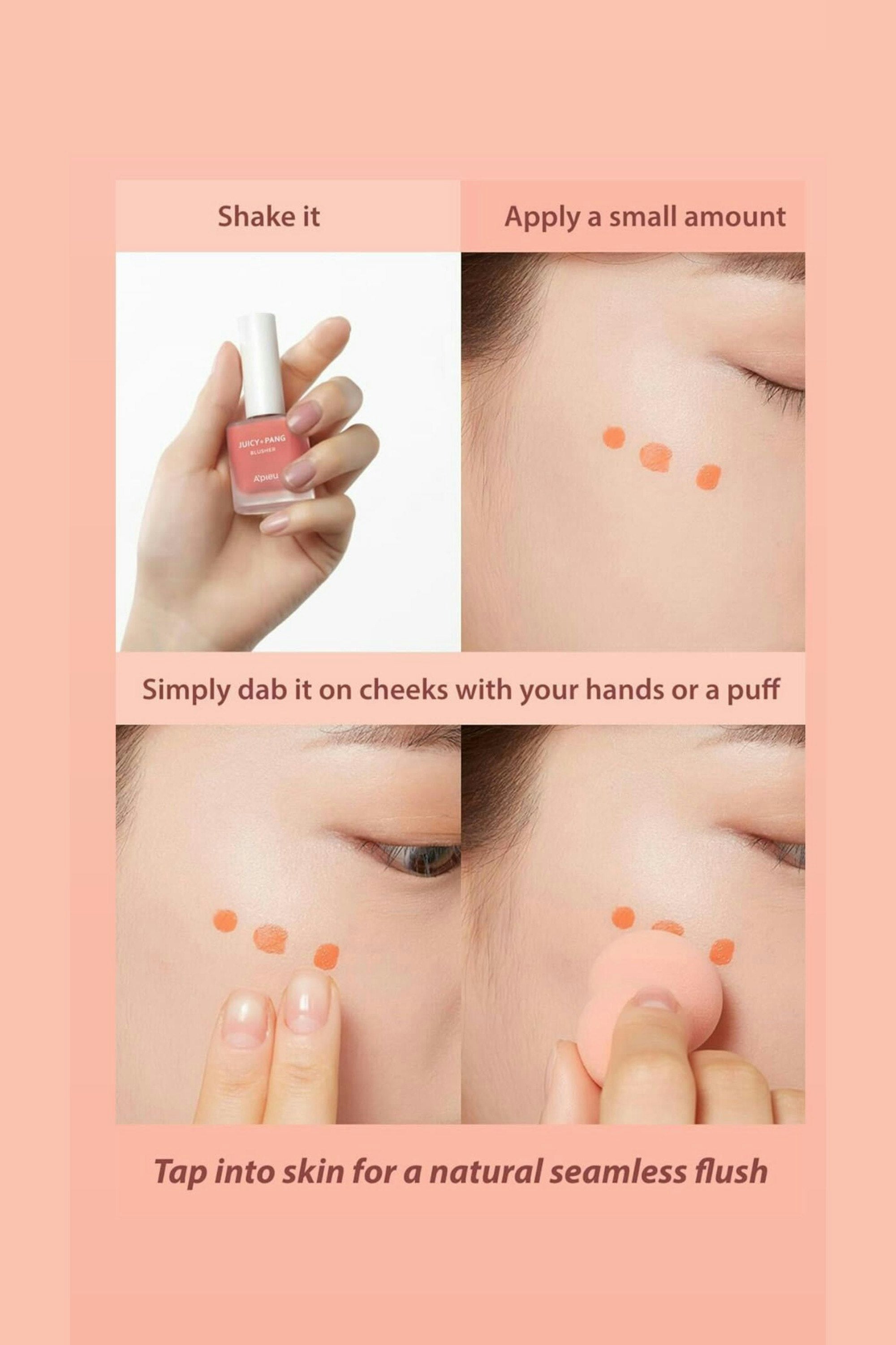 This water-light blush gives your cheeks that juicy, just-bitten flush in seconds. The texture melts in like watercolour, blending effortlessly with fingers for a dewy, glass-skin glow. Build it up for more tint or keep it sheer for that soft, I-woke-up-like-this vibe, never patchy, always fresh, always juicy. Dot a few drops on your cheeks, then blend with your fingertips or a sponge before it sets. Start light and build as you go—the tint layers beautifully without streaks. Tap, blend, and glow.