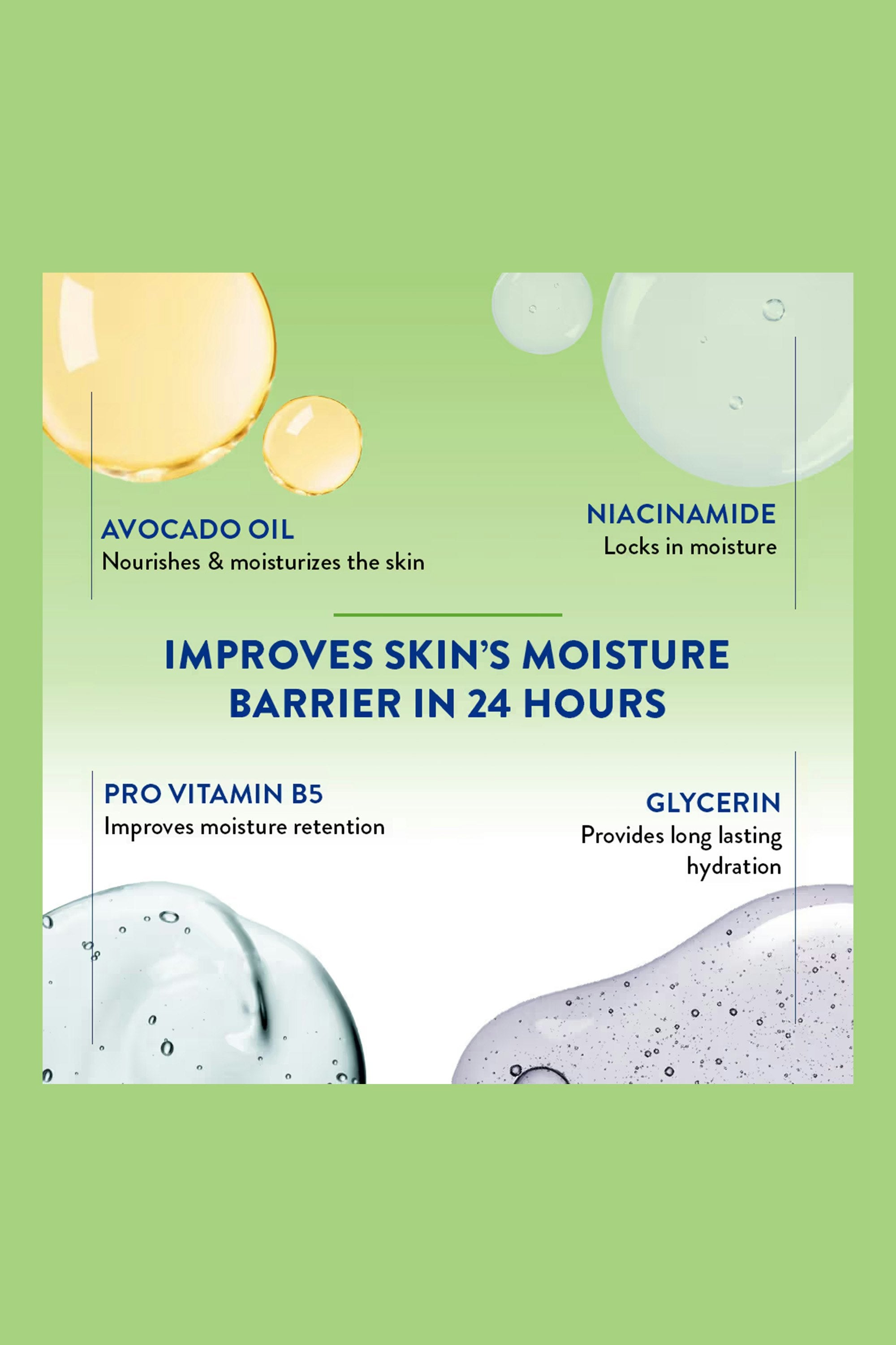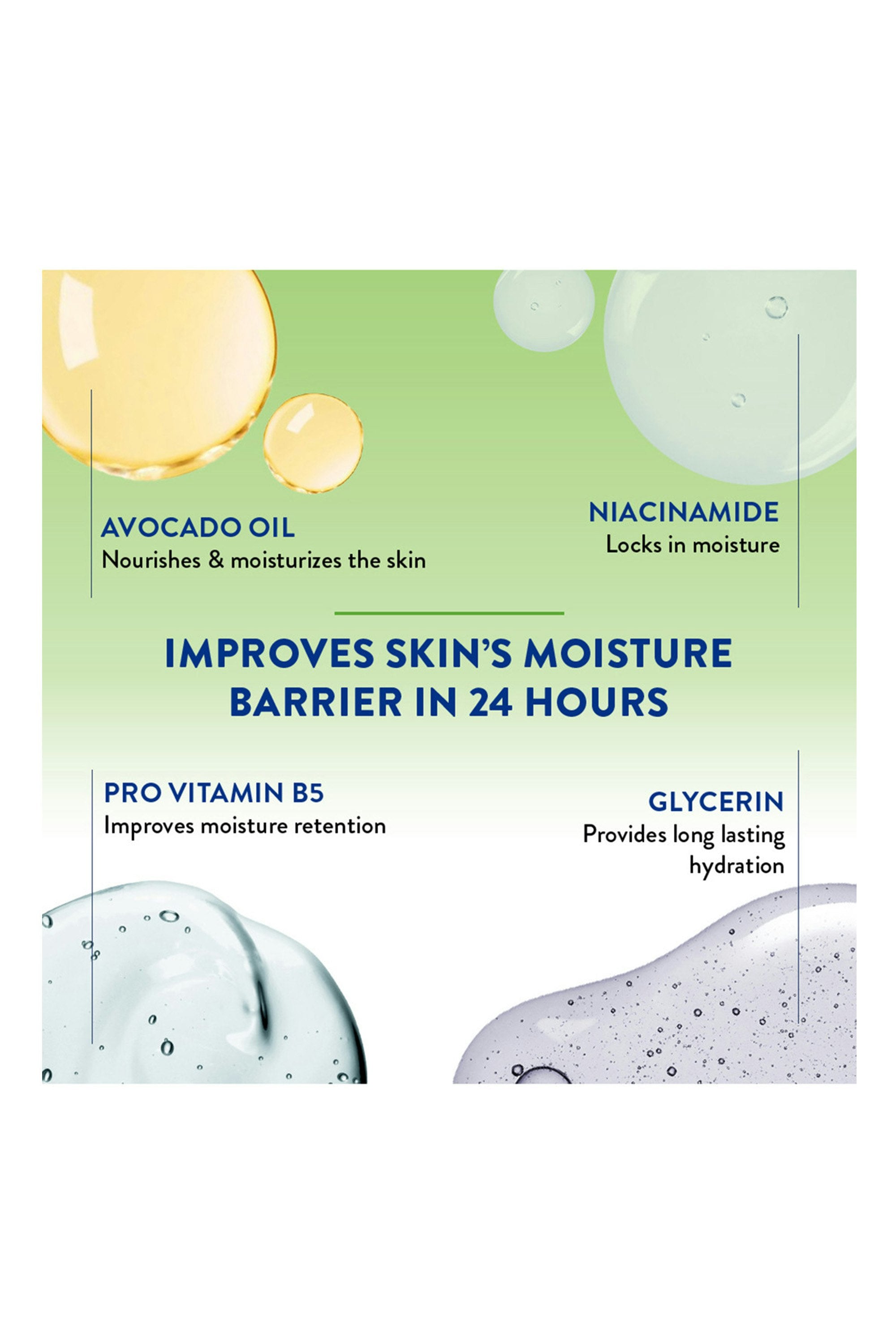 Avocado Oil, Sunflower Seed Oil, Vitamin E, Niacinamide, Panthenol, and Glycerin