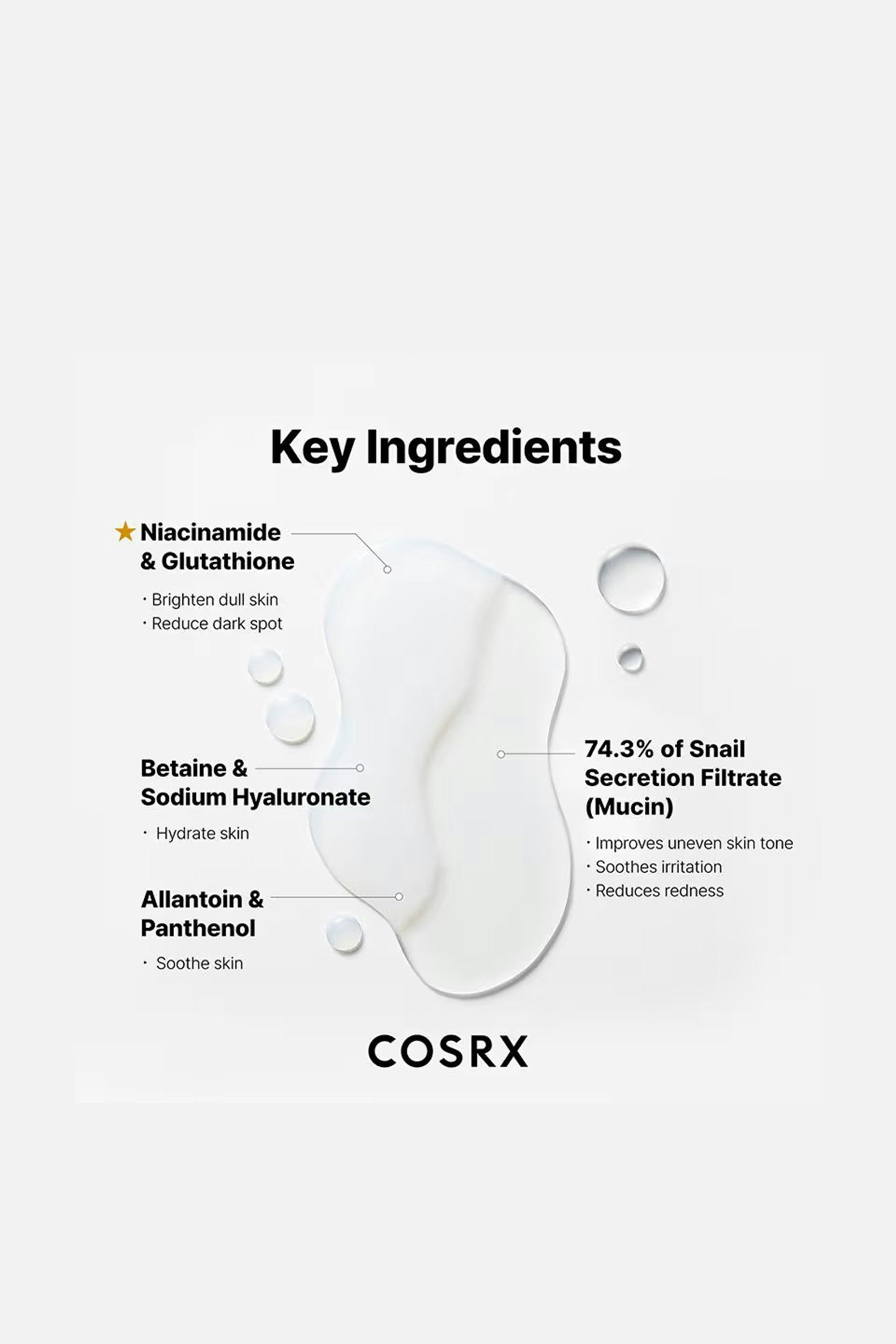 Snail Secretion Filtrate, Niacinamide, Hyaluronic Acid, Glutathione, Meadowfoam Seed Oil, Argan Oil, Macadamia Nut Oil, and Arginine