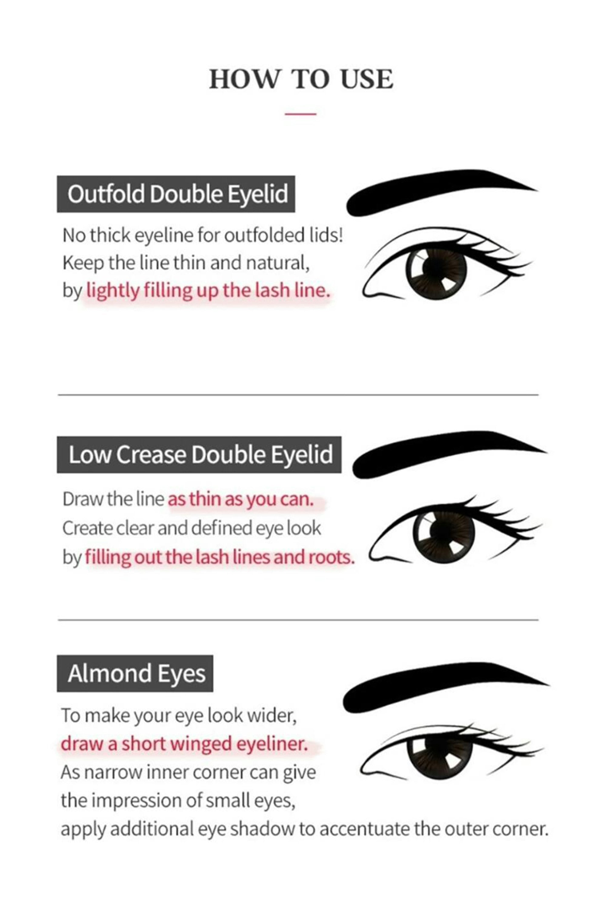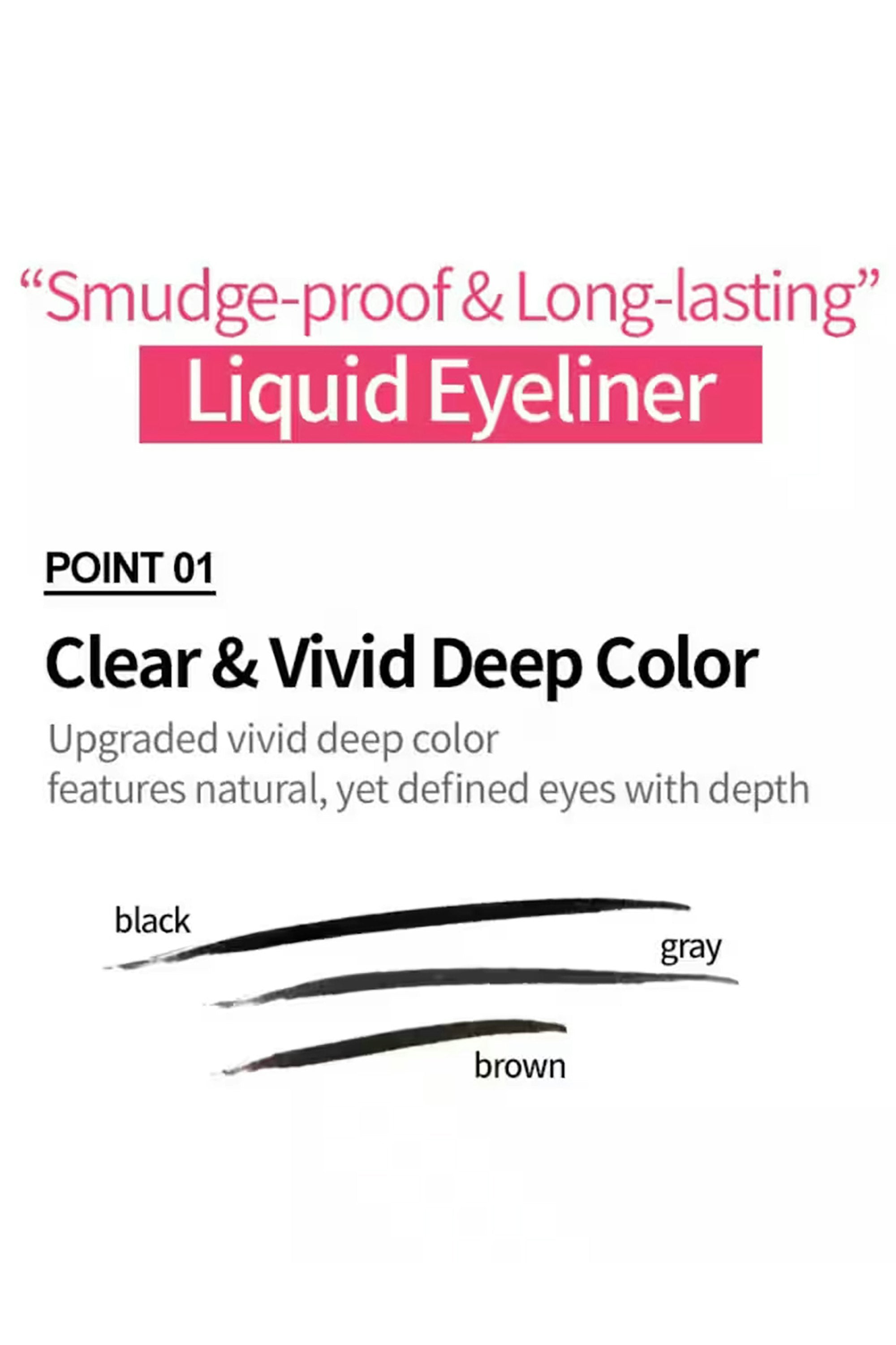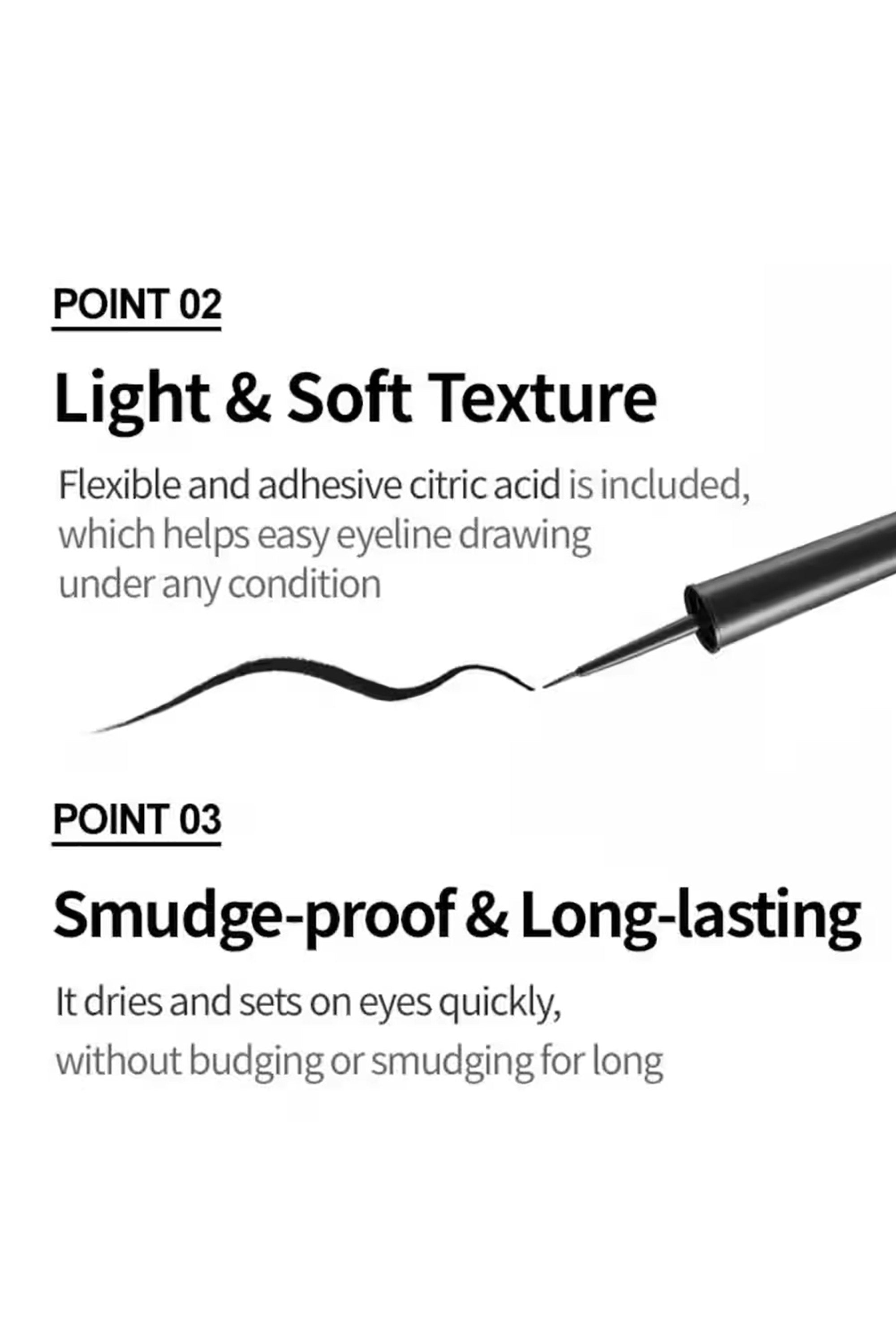 This eyeliner delivers a bold, vivid line that stays sharp from morning coffee to evening plans. The rich pigment glides on effortlessly and won’t budge, giving you a smudge‑proof, all‑day look that keeps up with your busiest days. Shake well before use. Wipe off extra product, then trace from the inner to outer corner along your lash line for a smooth, even stroke.