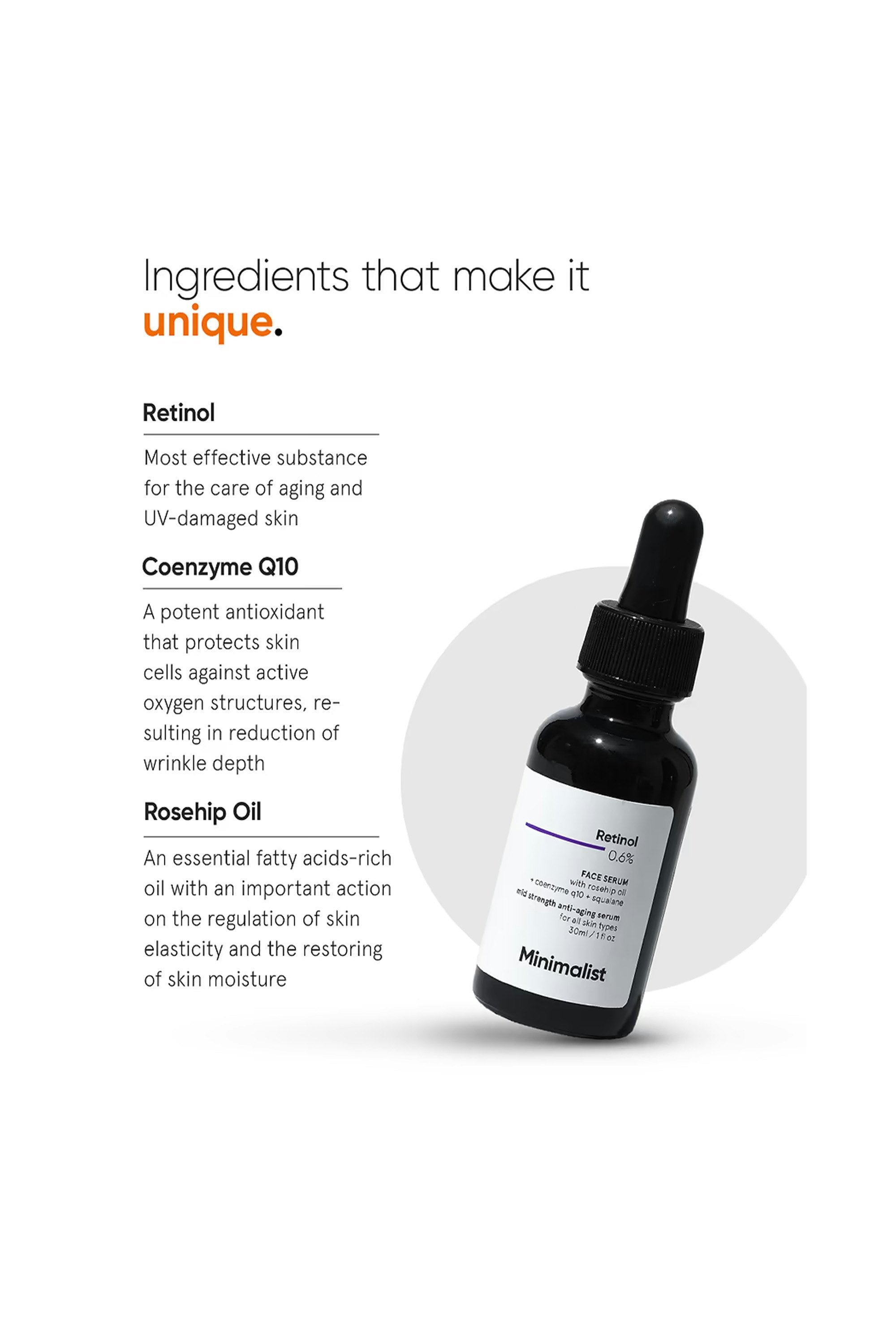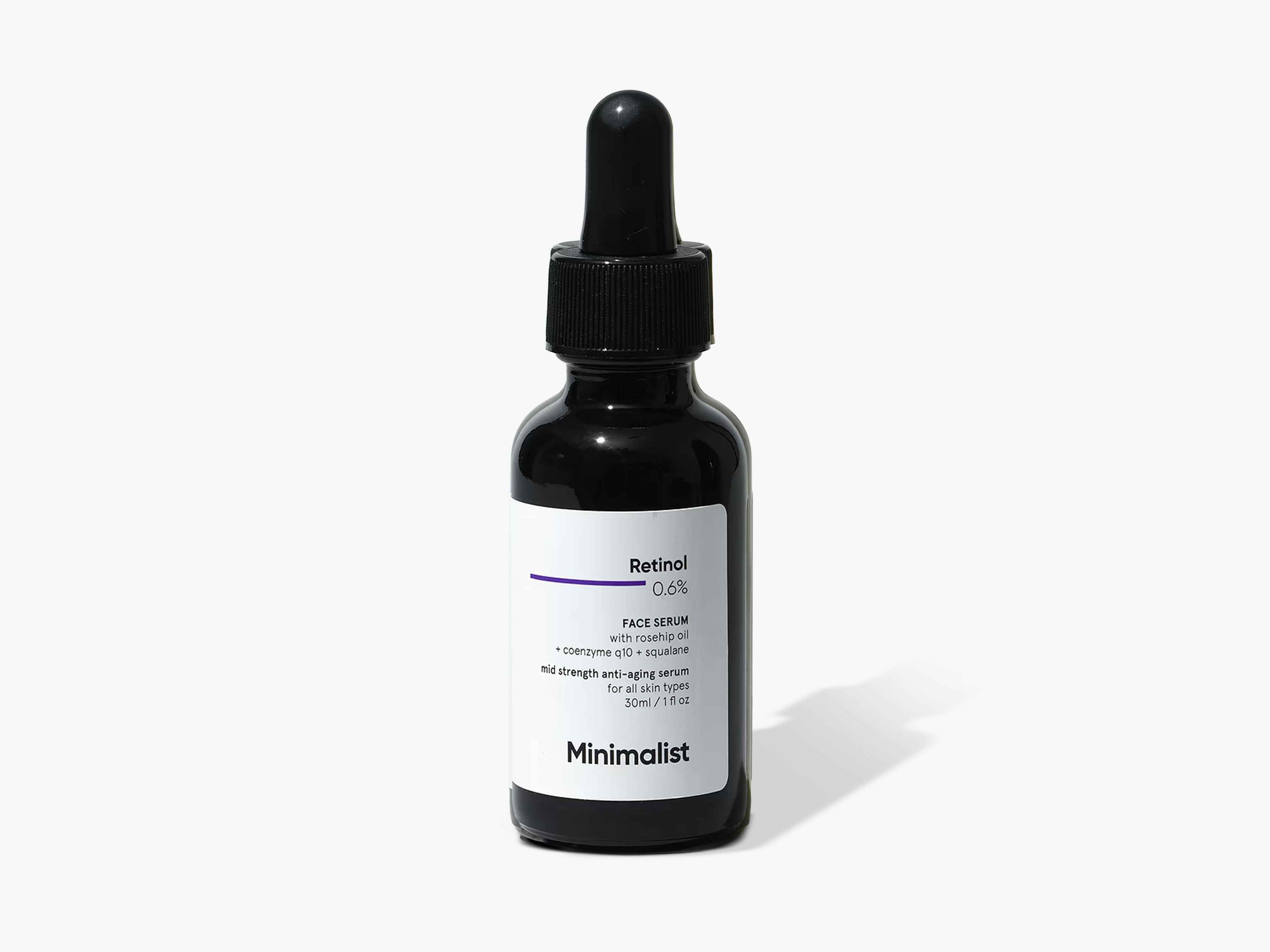 This medium-strength formula, enriched with retinol and coenzyme Q10, is designed to target signs of aging including fine lines, wrinkles, and uneven skin tone. Since retinol is an unstable molecule that oxidizes in the presence of water and light, this serum is water-free and uses rosehip oil & squalane as its base. The UV-protected bottle further enhances stability, ensuring the formula stays potent until the very last drop. Apply to a clean face, after your water-based serums and before moisturizer. Gently pat the product in. Don't forget to apply sunscreen the next morning. Start by using it every 3 days, slowly building up your tolerance and frequency of use to every day. Avoid using it alongside chemical exfoliants, physical scrubs, or other actives. Store in a cool, dark place away from sunlight.