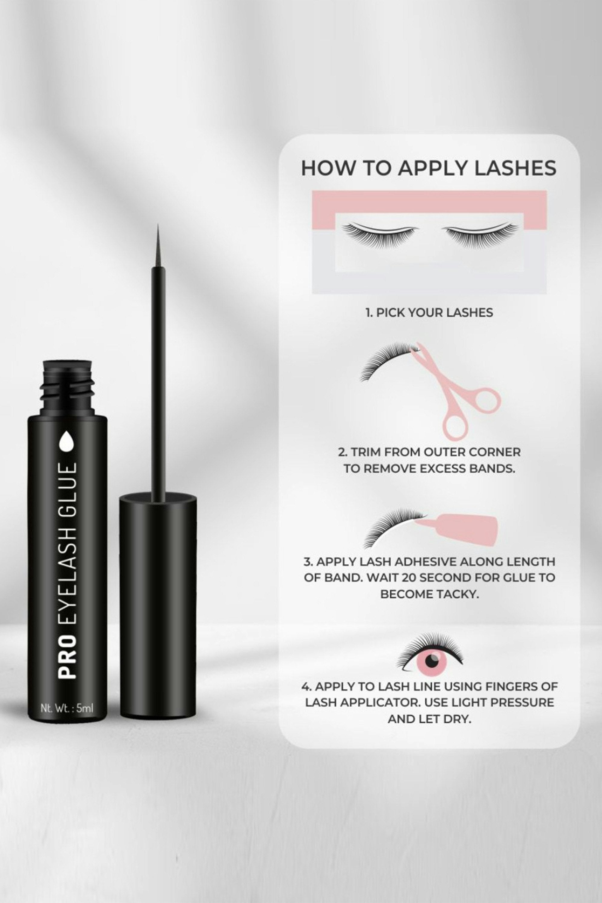 Eyelash Glue keeps your lashes secure all day with its 24-hour long-lasting hold. The latex-free, waterproof formula makes it safe for contact lens wearers and those with latex allergies. The white adhesive dries clear for a seamless finish, while the built-in brush ensures easy application with minimal glue wastage. Pick your lashes and trim the outer corner if needed. Apply a thin layer of glue along the lash band and wait 20 seconds until it turns tacky. Place the lashes on your lash line using fingers or an applicator, press gently, and let dry.