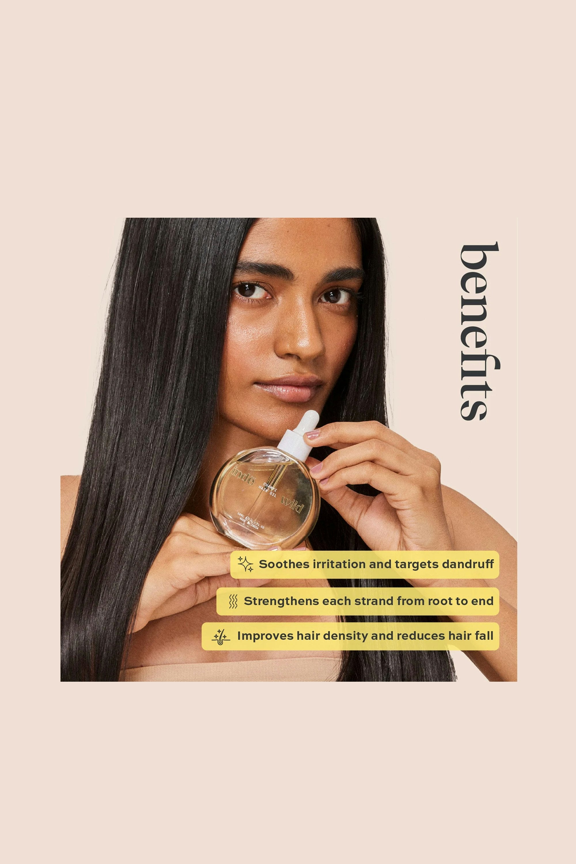 This viral hair oil brings the ancient practice of "champi" to the modern day, transforming your hair care routine into a ritual of sacred self-care. Honouring centuries-old Ayurvedic traditions, this luxurious blend is designed to strengthen and rejuvenate your hair from root to tip. Enriched with potent ingredients like Amla, Brahmi, and Bhringraj, it deeply penetrates the scalp to promote hair growth, soothe irritation, and add a lustrous shine. Can be used once a week as a head massage oil, as a pre-shampoo mask, or as an overnight treatment. Generously massage 2-3 pipettes of the product onto the scalp, working it all the way to the ends of your hair. Leave in for a minimum of 20 minutes before rinsing with shampoo. Pro Tip: Warm the oil for up to 10 seconds before application for deeper penetration and increased circulation to the scalp.