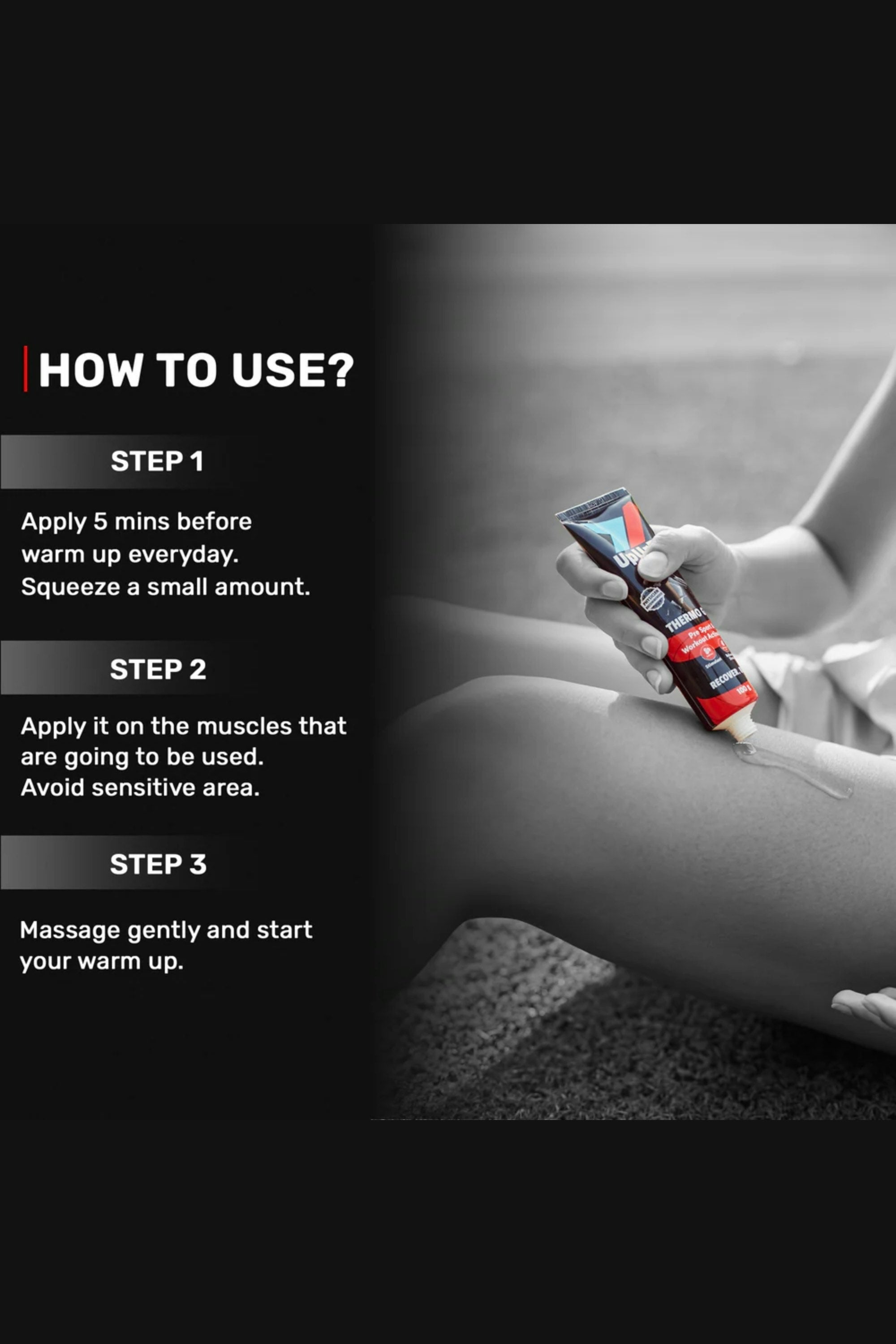 Boost your warm-up with this Gel—an invigorating formula that generates heat, stimulates circulation, and energizes muscles so you can start every workout at your best. Simply apply a thin layer to your muscles or joints before exercise and massage gently until fully absorbed. Within 3–5 minutes, you’ll feel the soothing warmth—just avoid contact with eyes and sensitive areas.