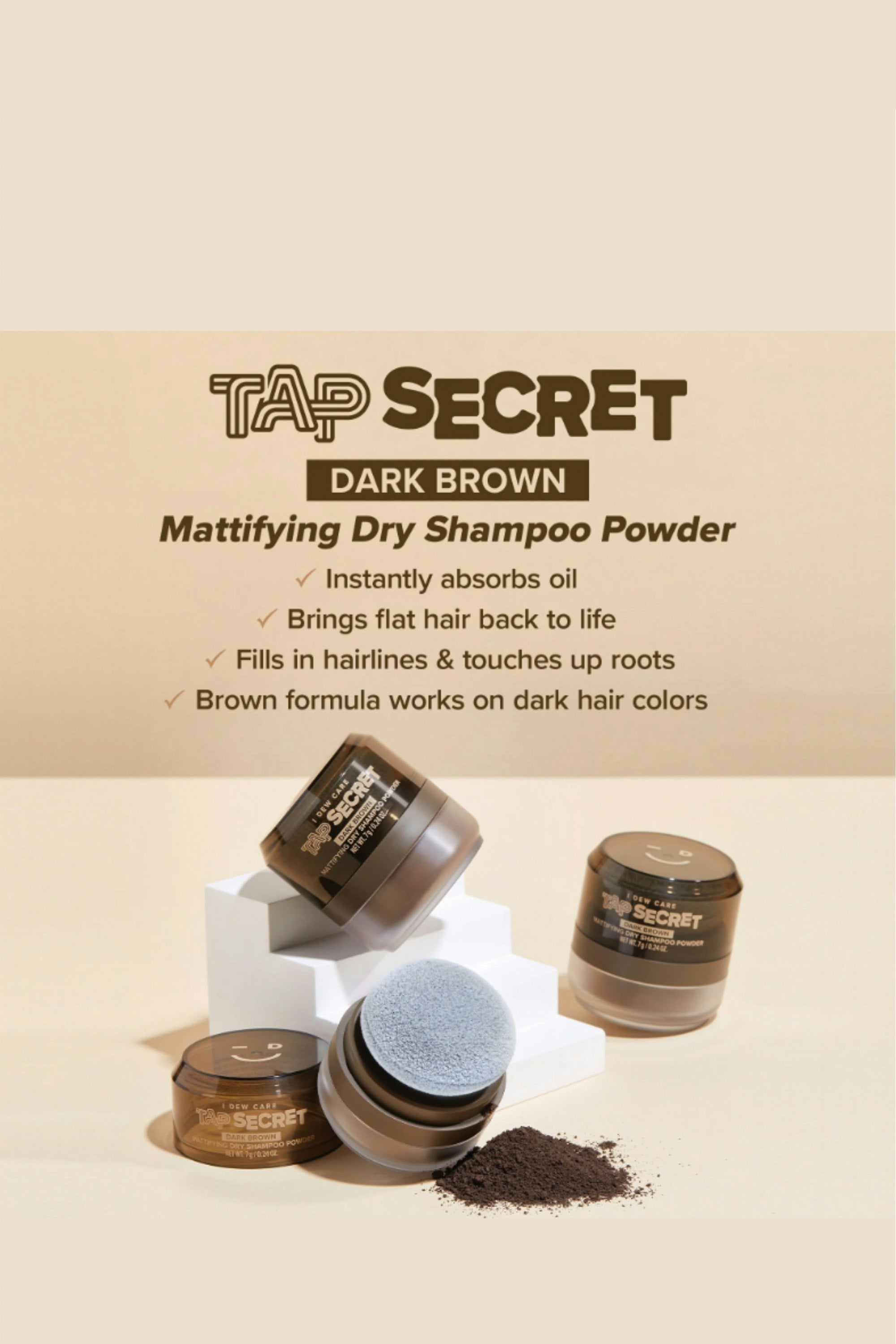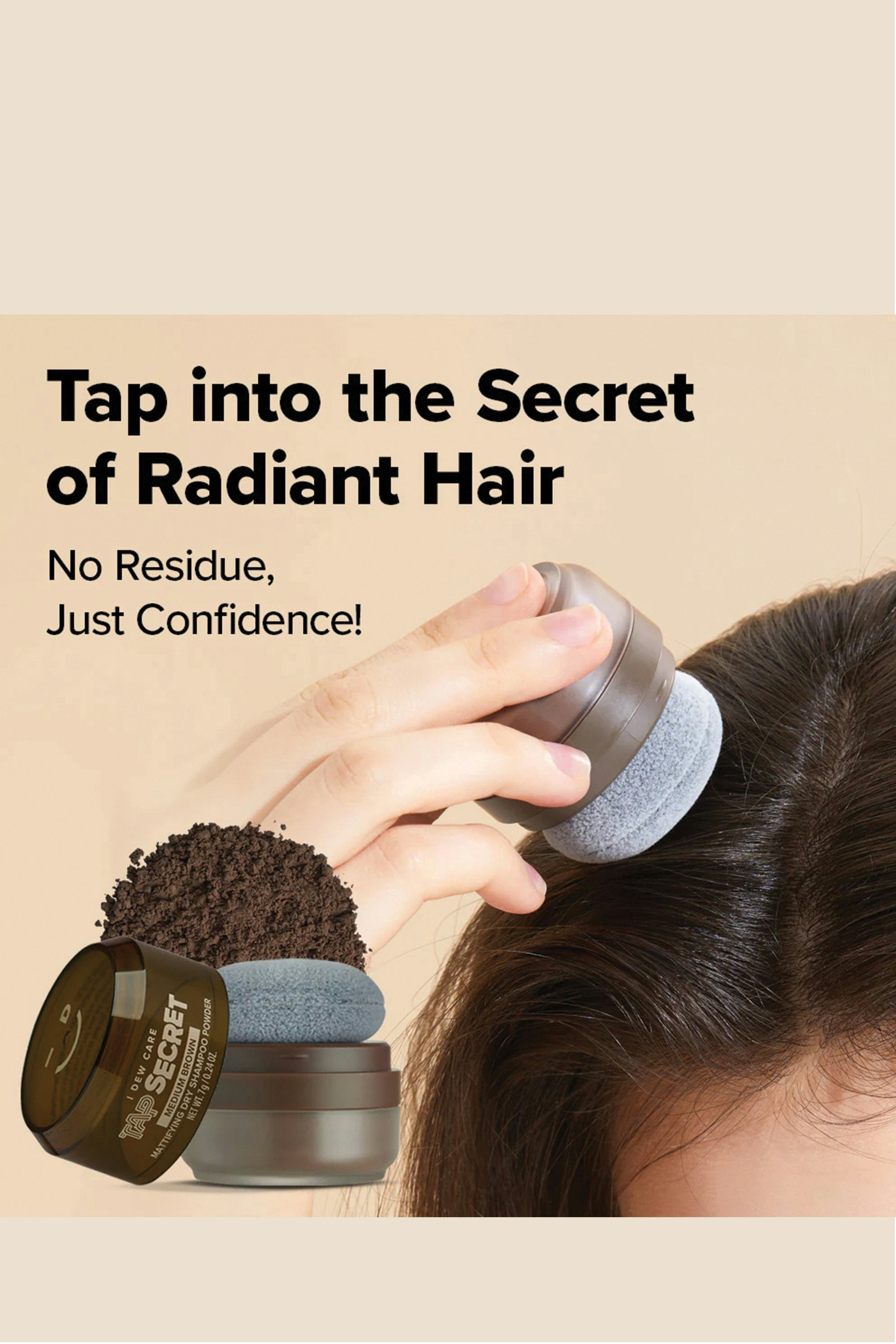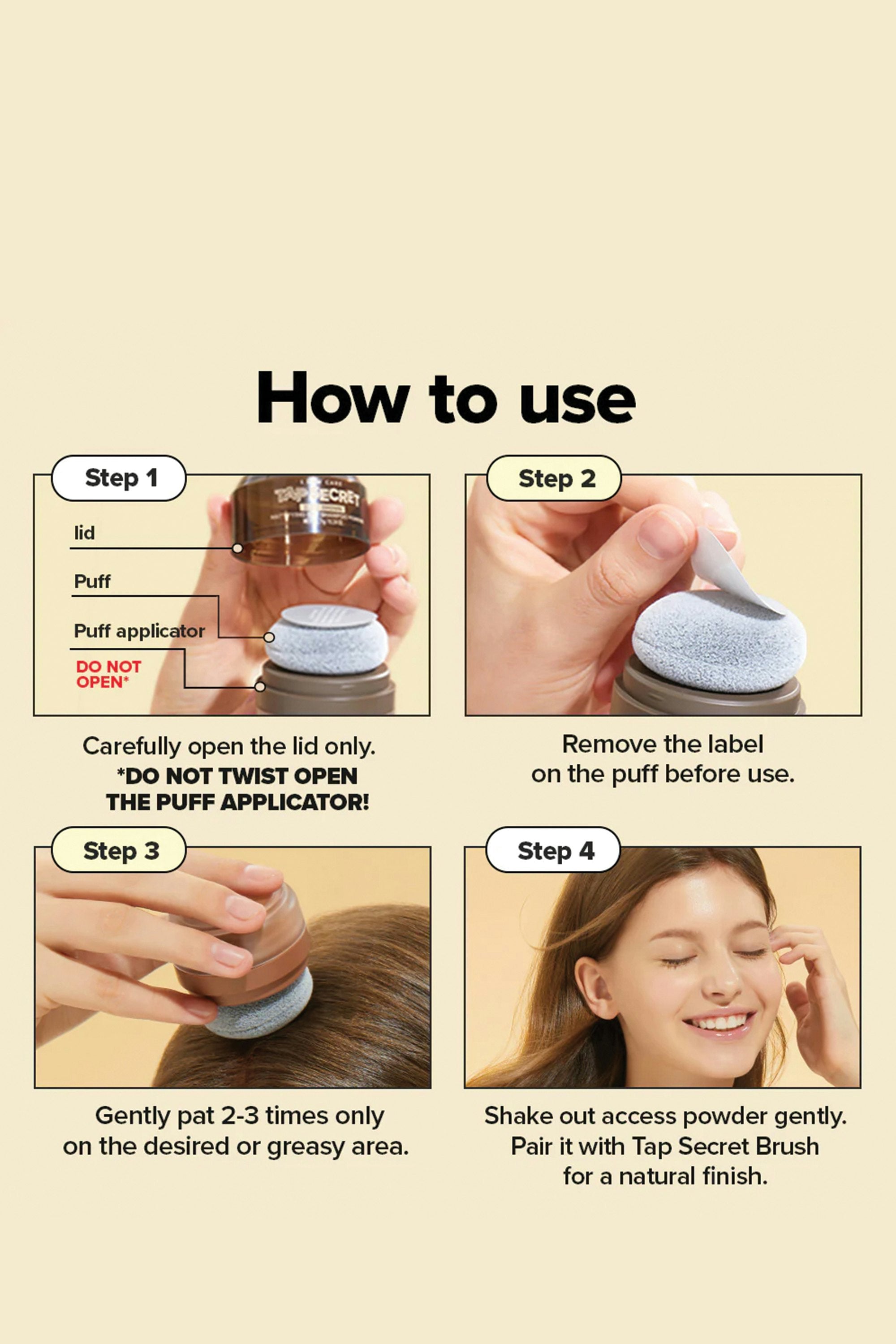 Hit refresh anywhere, anytime! Tap Secret is an award-winning, travel-friendly mattifying dry shampoo powder that absorbs oil, banishes grease, and boosts volume—without water. Packaged in a compact, no-mess puff applicator, it makes touch-ups effortless whether you’re at the gym, on a flight, or in between wash days. Pat the applicator on the desired hair area 3–5 times, focusing on the roots. Then shake out any excess powder with your fingertips and tidy up your hair to finish.