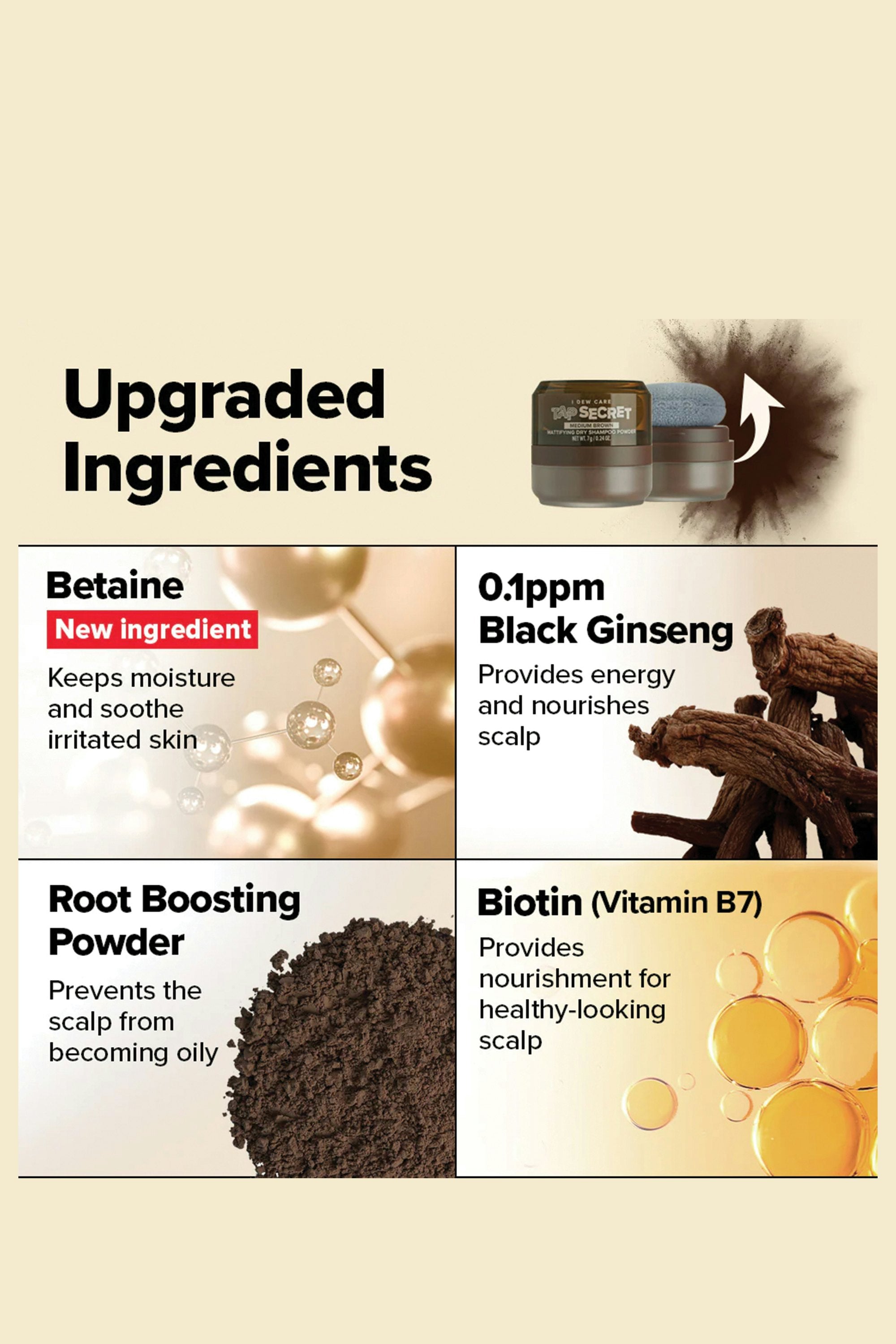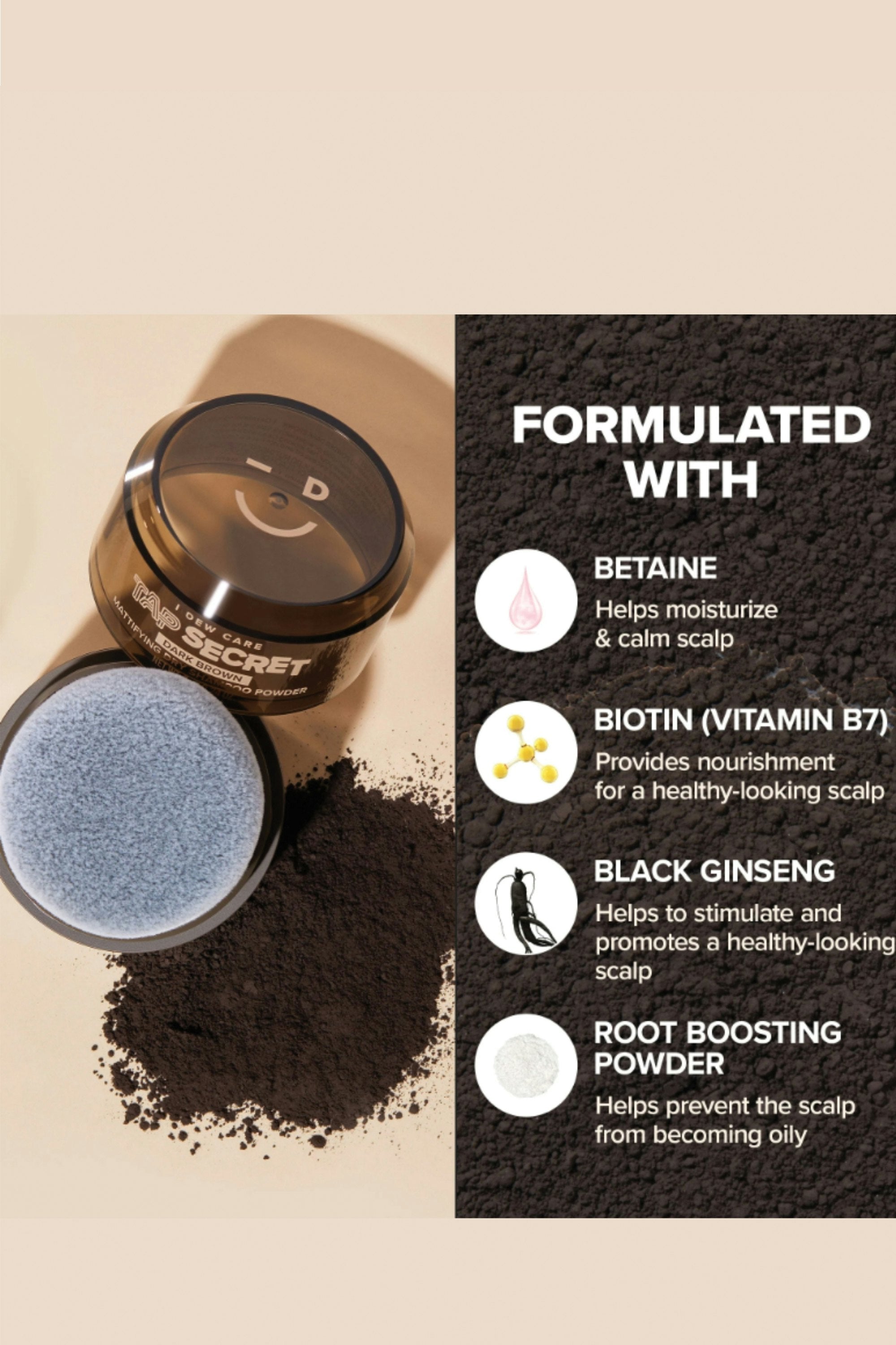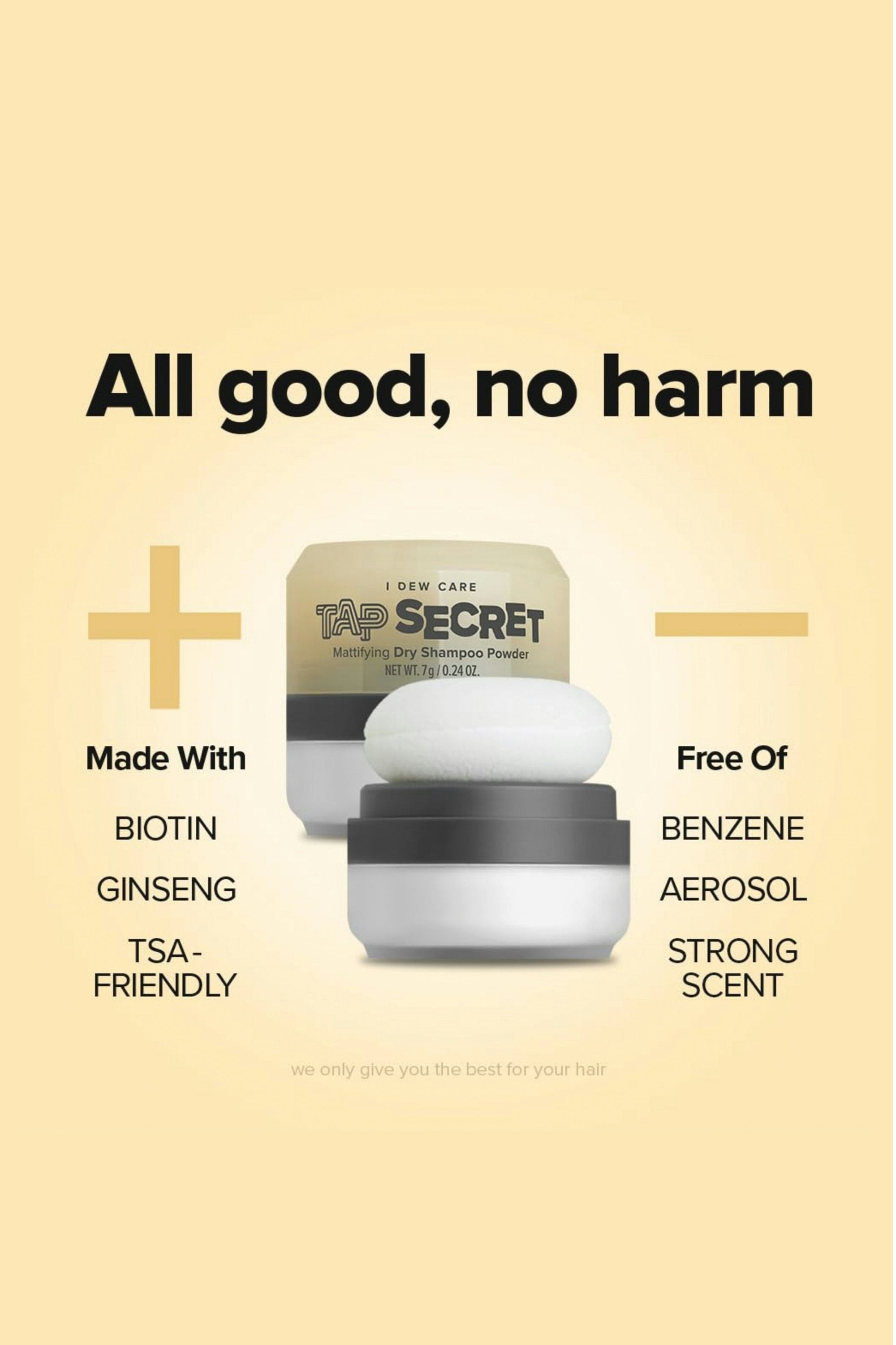 Hit refresh anywhere, anytime! Tap Secret is an award-winning, travel-friendly mattifying dry shampoo powder that absorbs oil, banishes grease, and boosts volume—without water. Packaged in a compact, no-mess puff applicator, it makes touch-ups effortless whether you’re at the gym, on a flight, or in between wash days. Pat the applicator on the desired hair area 3–5 times, focusing on the roots. Then shake out any excess powder with your fingertips and tidy up your hair to finish.