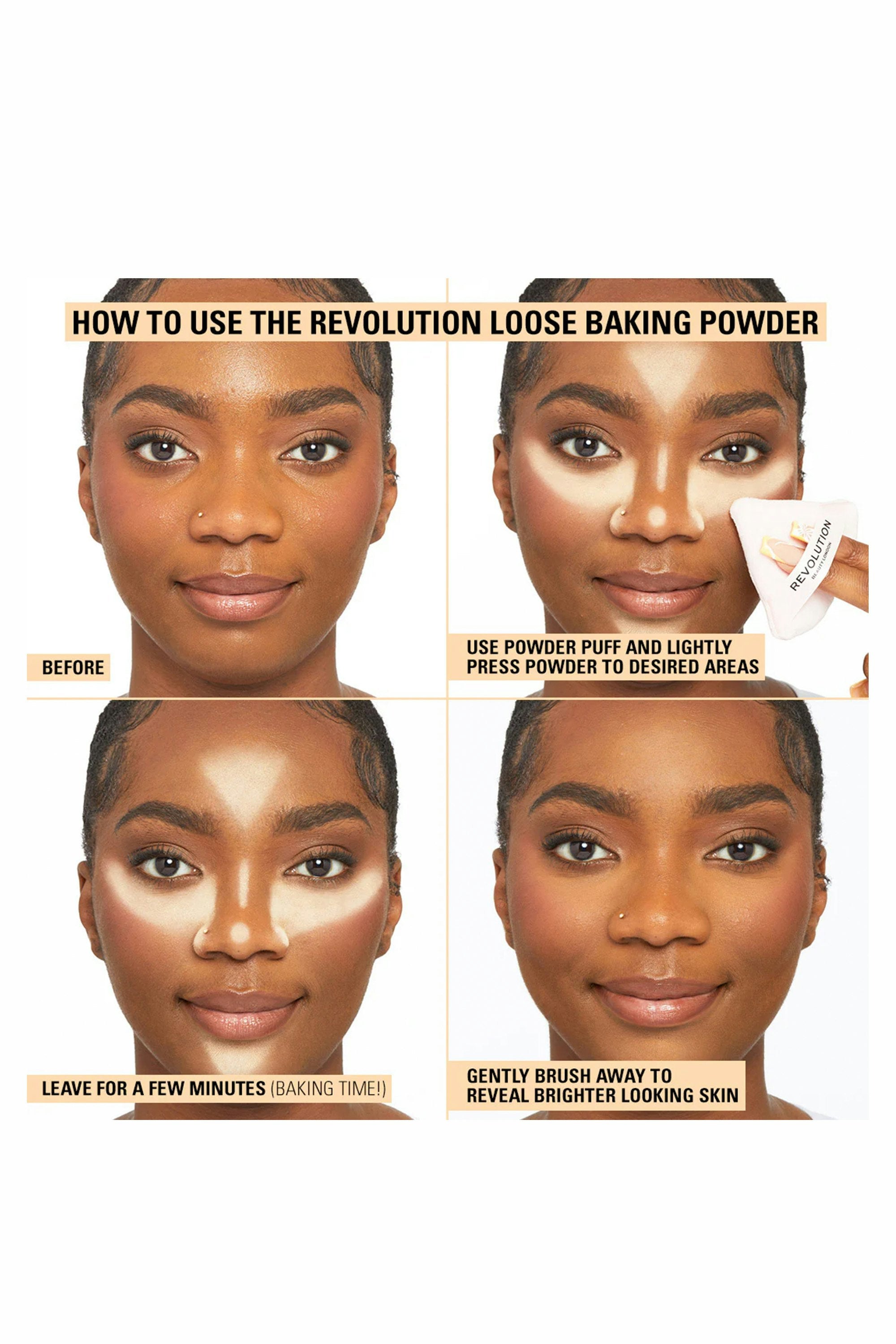 Our go-to for makeup that stays put, fights shine, and adds that perfect balance to your skin tone. Simply use a Brush or dab and dust off. Want a natural finish? Fluffy brush, all the way. For baking precision, grab that sponge makeup applicator. It's a game-changer! Get your bake on, babe! Use a makeup sponge to bake those highlighted areas – let it sit for a few, then gently swipe away. Set that makeup and unveil brighter, flawless skin.