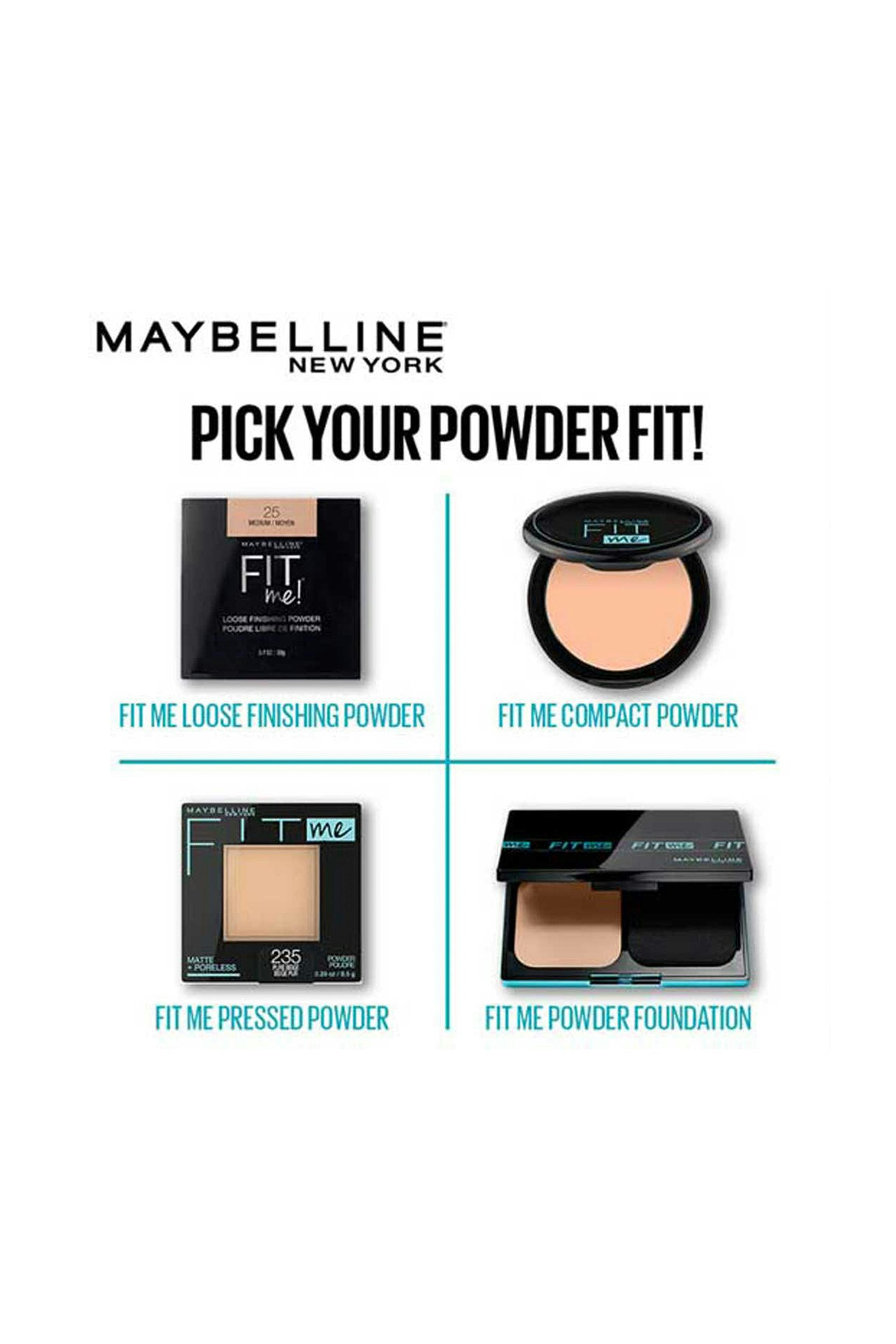 Fit Me Matte + Poreless Powder from Maybelline New York goes beyond skin tone matching to fit the unique texture issues of normal to oily skin for the ultimate natural skin fit! It also provides long-lasting, mattifying, shine control and up to 12HR wear for a seamless, poreless-looking finish with a buildable coverage. Using the included applicator, apply to the forehead, nose, cheeks, and chin and blend all over using gentle downward strokes. Can be worn alone or on top of foundation.