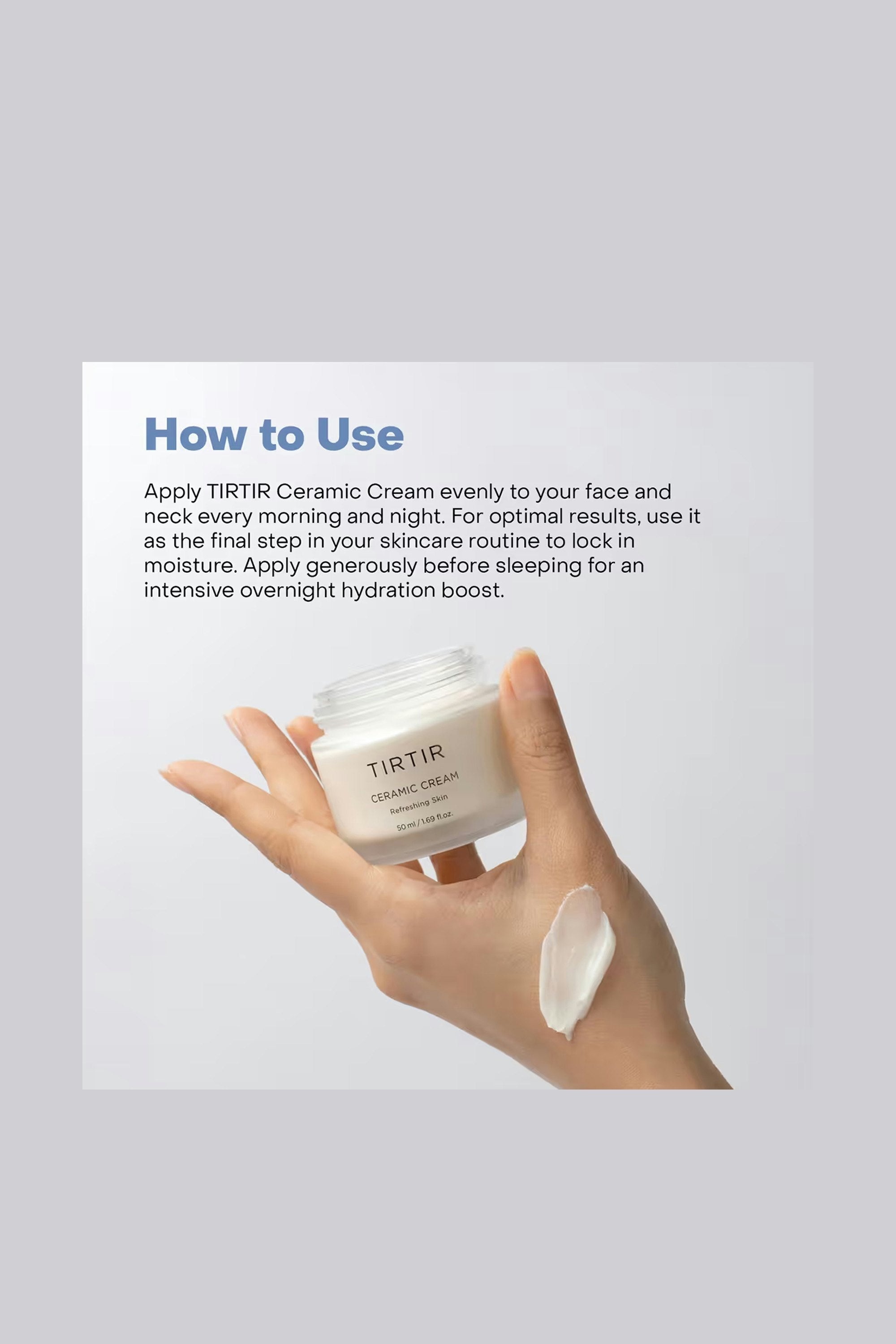 Say hi to the Tirtir Ceramic Cream—your ultimate hydration hero! Packed with Ceramide NP and Shea Butter, it instantly quenches dry skin, leaving it silky smooth. Infused with Witch Hazel and Licorice Root, it soothes and brightens. With antioxidant-rich botanicals like Rosemary and Centella, this cream is your go-to for a radiant, dewy glow Apply to your face and neck morning and night, as the final step in your routine. Use generously before bed for a hydration boost overnight.