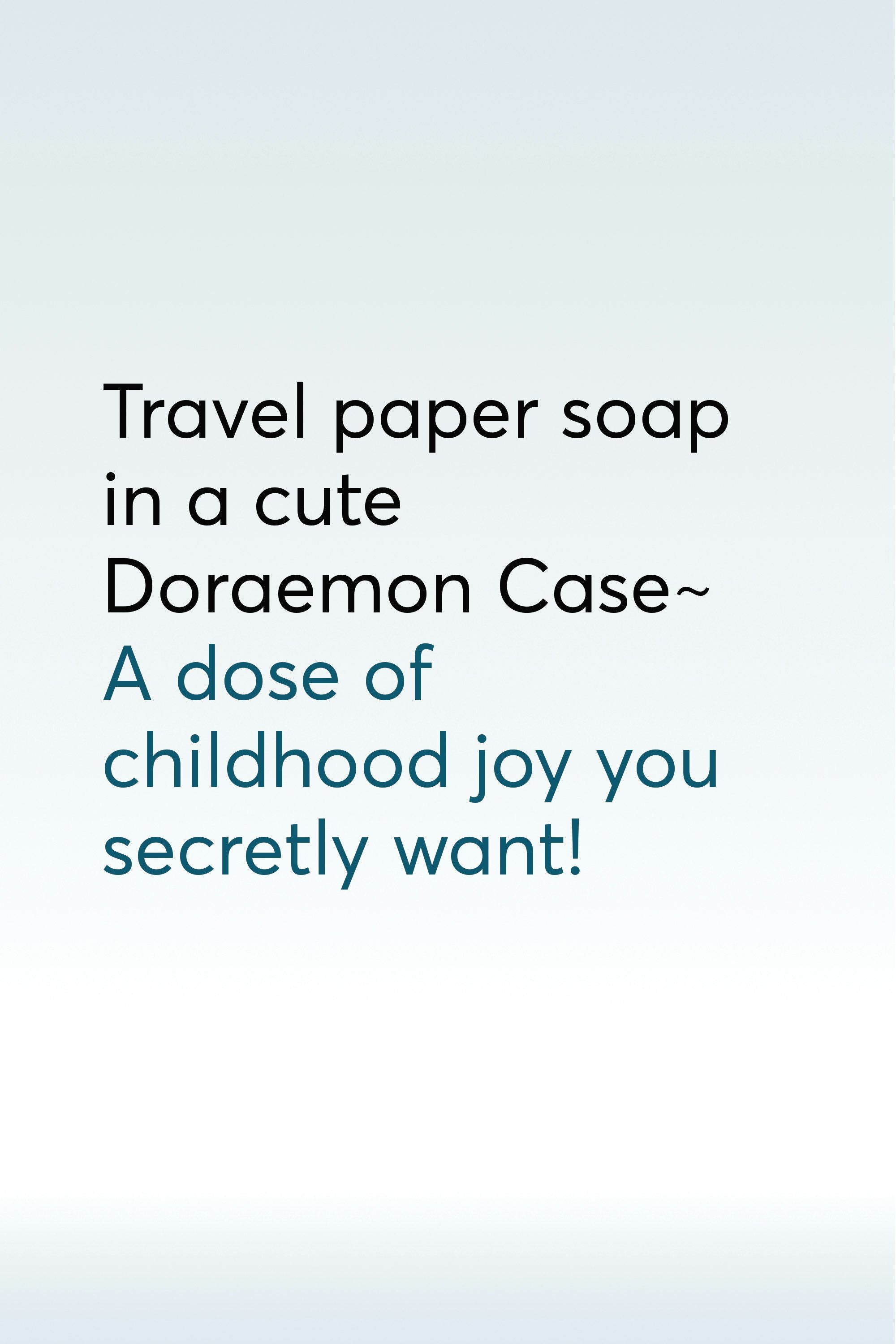 A pack of 50 portable paper-thin soap sheets featuring the beloved Doraemon design. Just add water to dissolve a sheet into a gentle lather for quick handwashing anywhere—perfect for travel. Take out one paper soap sheet, place it on your palm, add a little water, and rub to create lather. Rinse thoroughly with water and dispose of any residue.