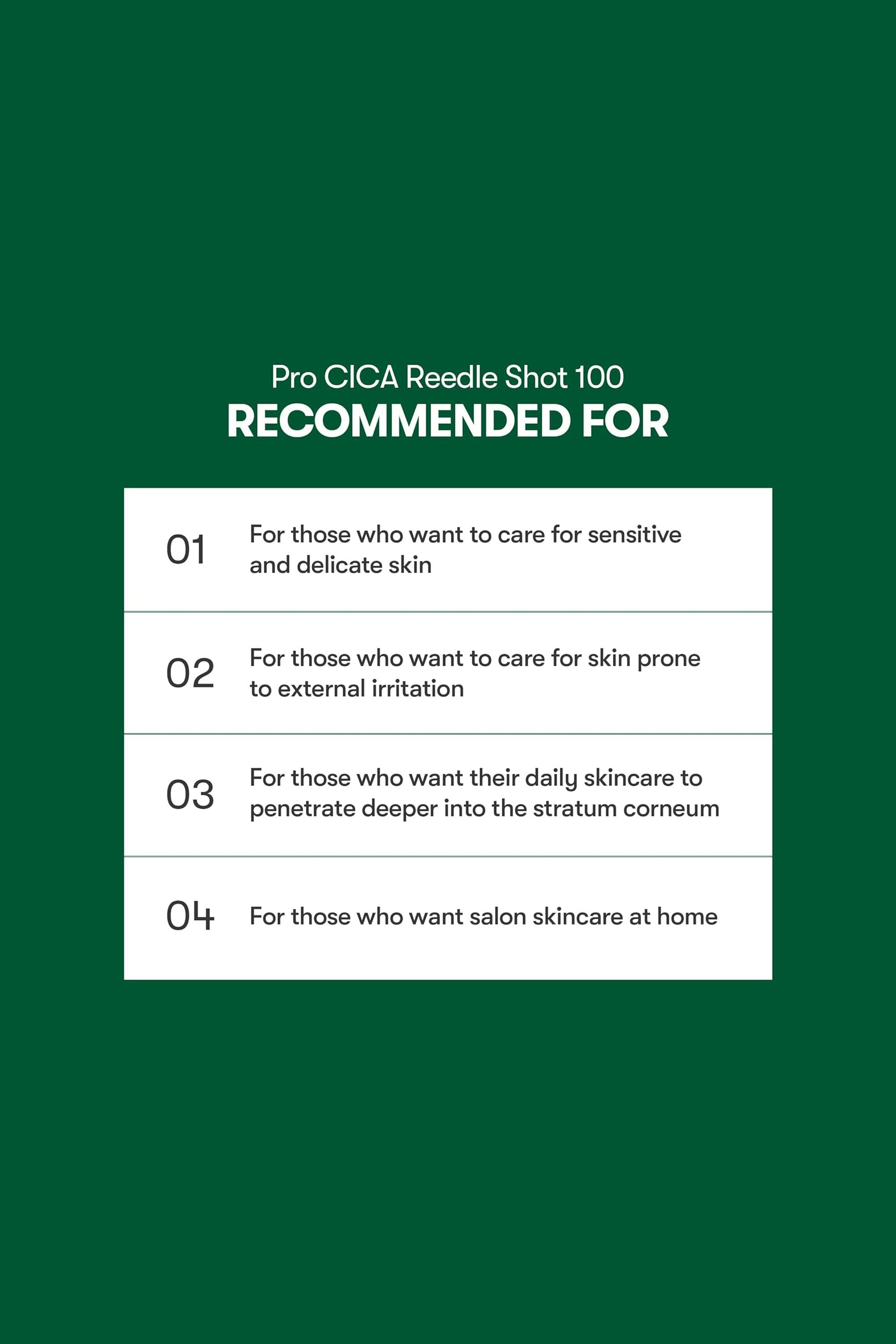 This is soothing care with a little more bite. Extra reedles push cica deeper to support stressed-out skin. The buzz is noticeable—some might love the kick, others not so much. Over time it helps build stronger, calmer vibes Spread evenly on clean, dry skin after cleansing and massage in. The sting is sharper than 100, so keep it to every 3 days. Avoid pairing with devices or using right after cosmetic procedures, and pause if irritation shows up