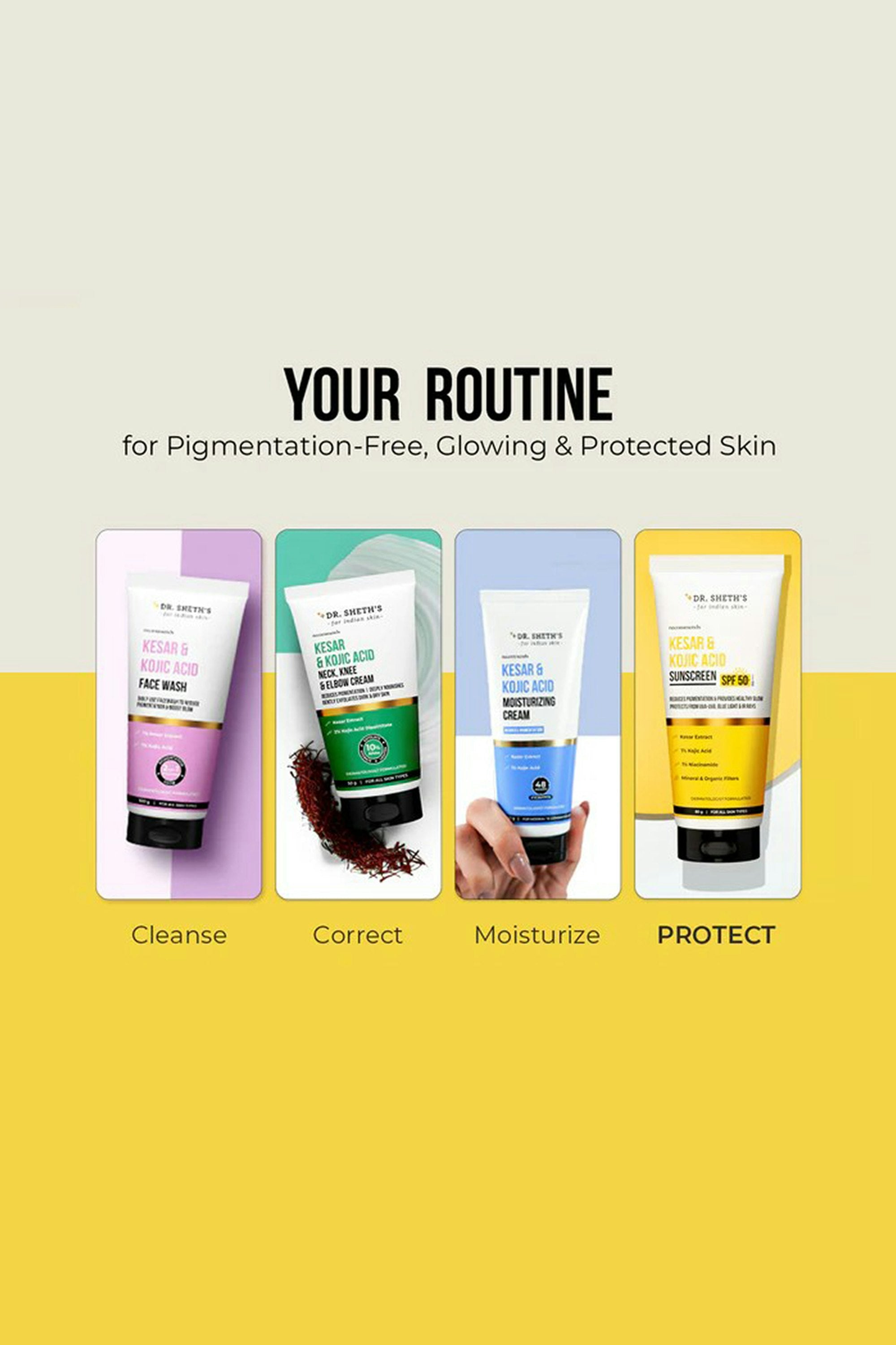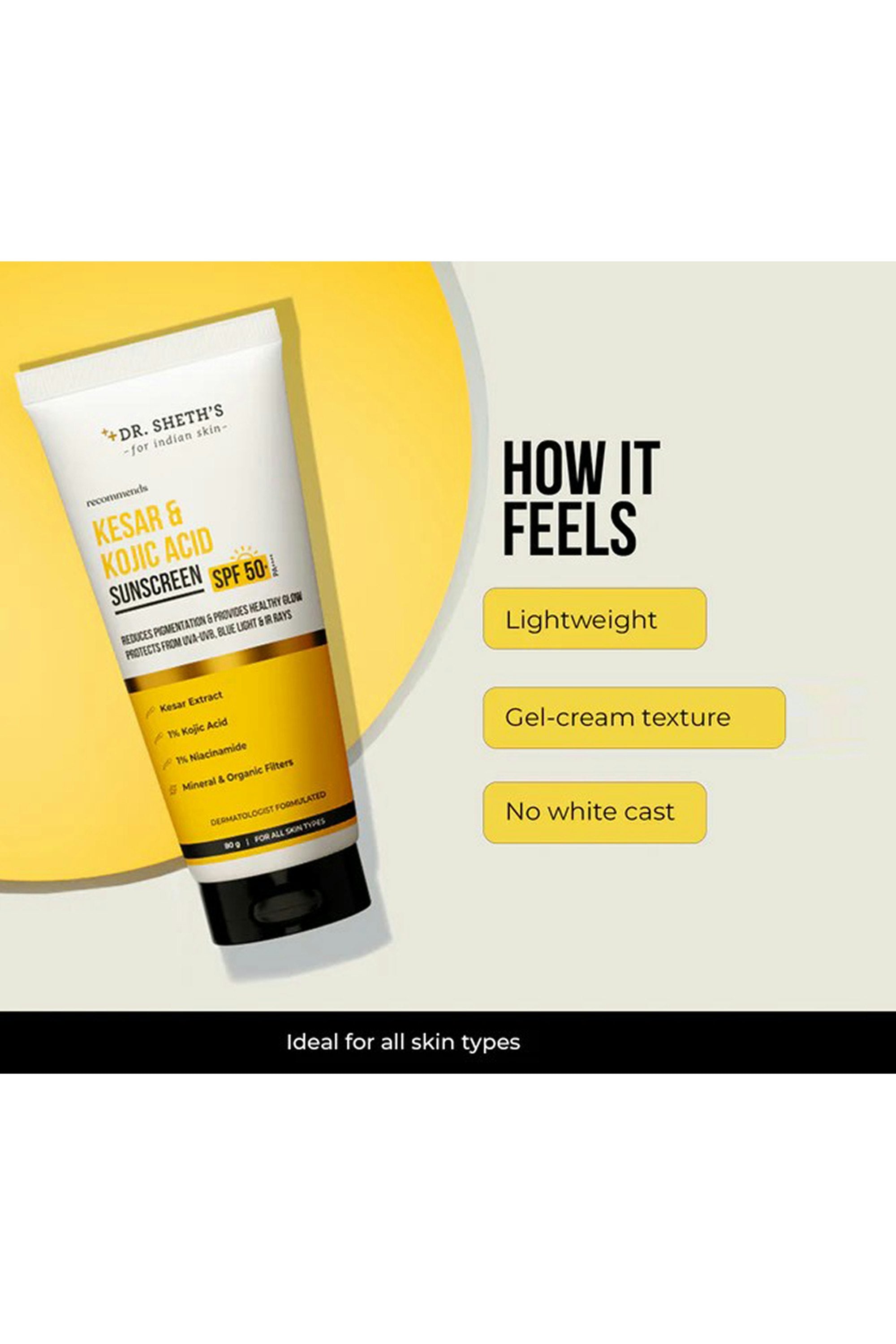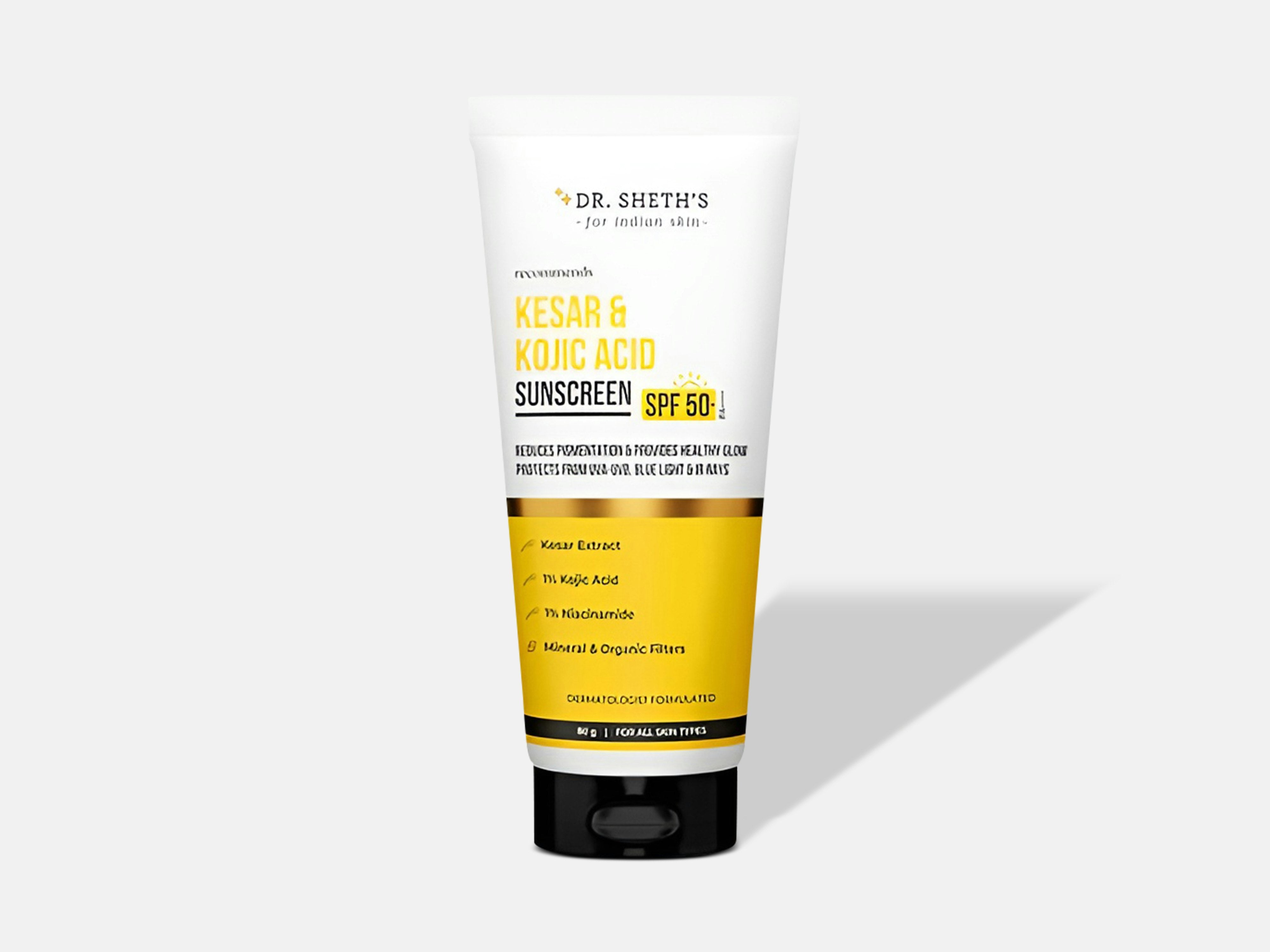 A brightening, protective sunscreen that does more than just shield. Powered with kesar and kojic acid, it helps visibly fade dark spots and boost radiance while offering high UVA/UVB protection. The lightweight texture blends seamlessly without white cast, making it perfect for daily use if you want sun protection and brighter, more even-toned skin. Apply generously as the last step of your routine before sun exposure. Spread evenly over your face and neck, and let it absorb completely. Reapply every 2–3 hours when outdoors for optimal protection.