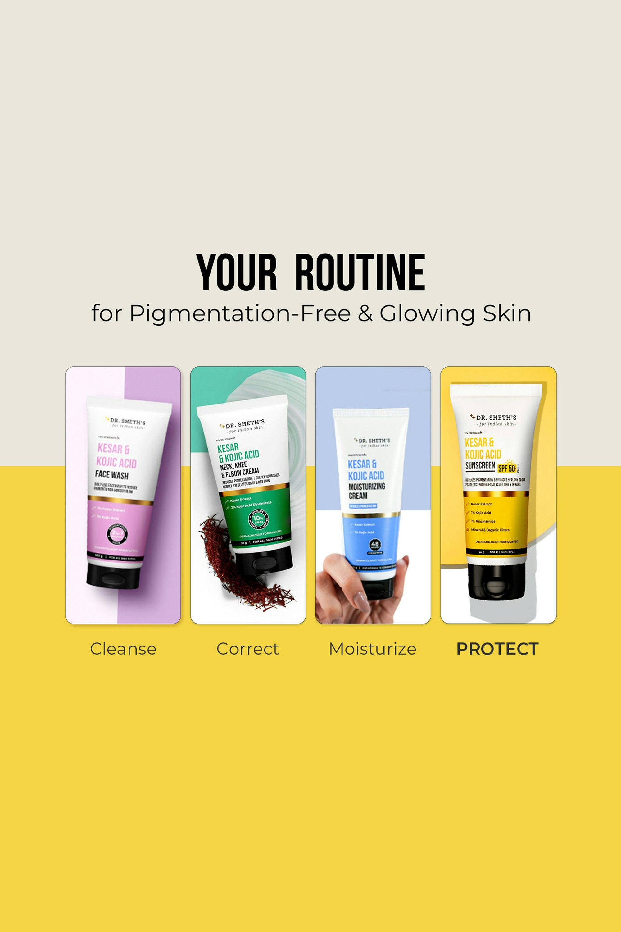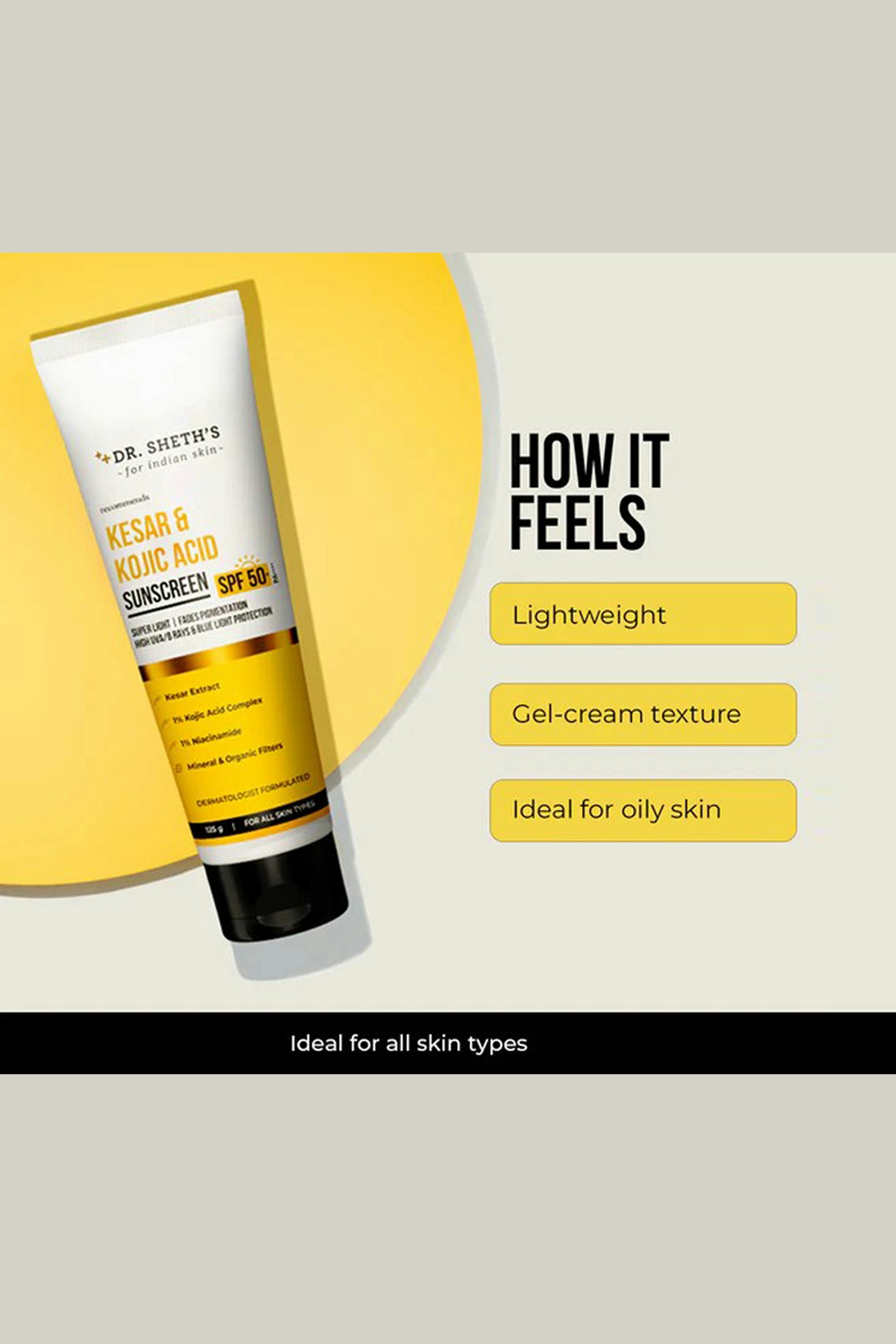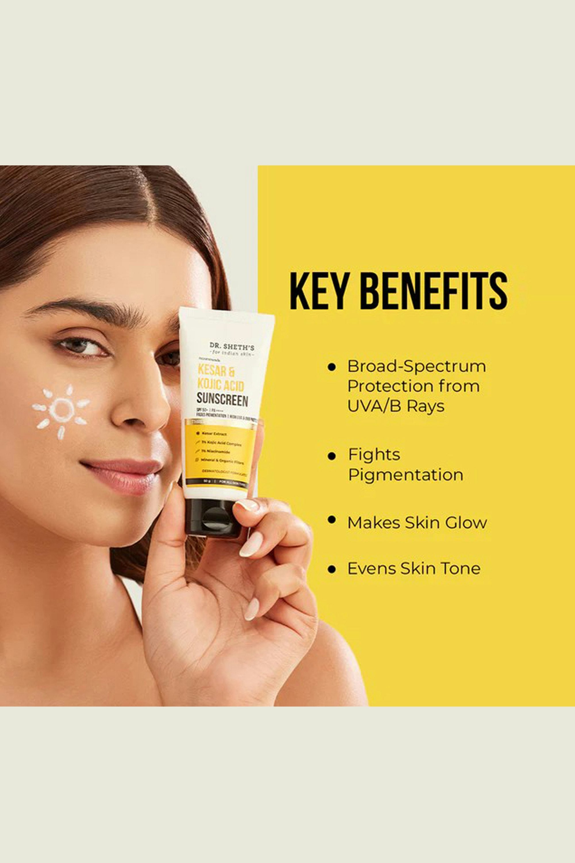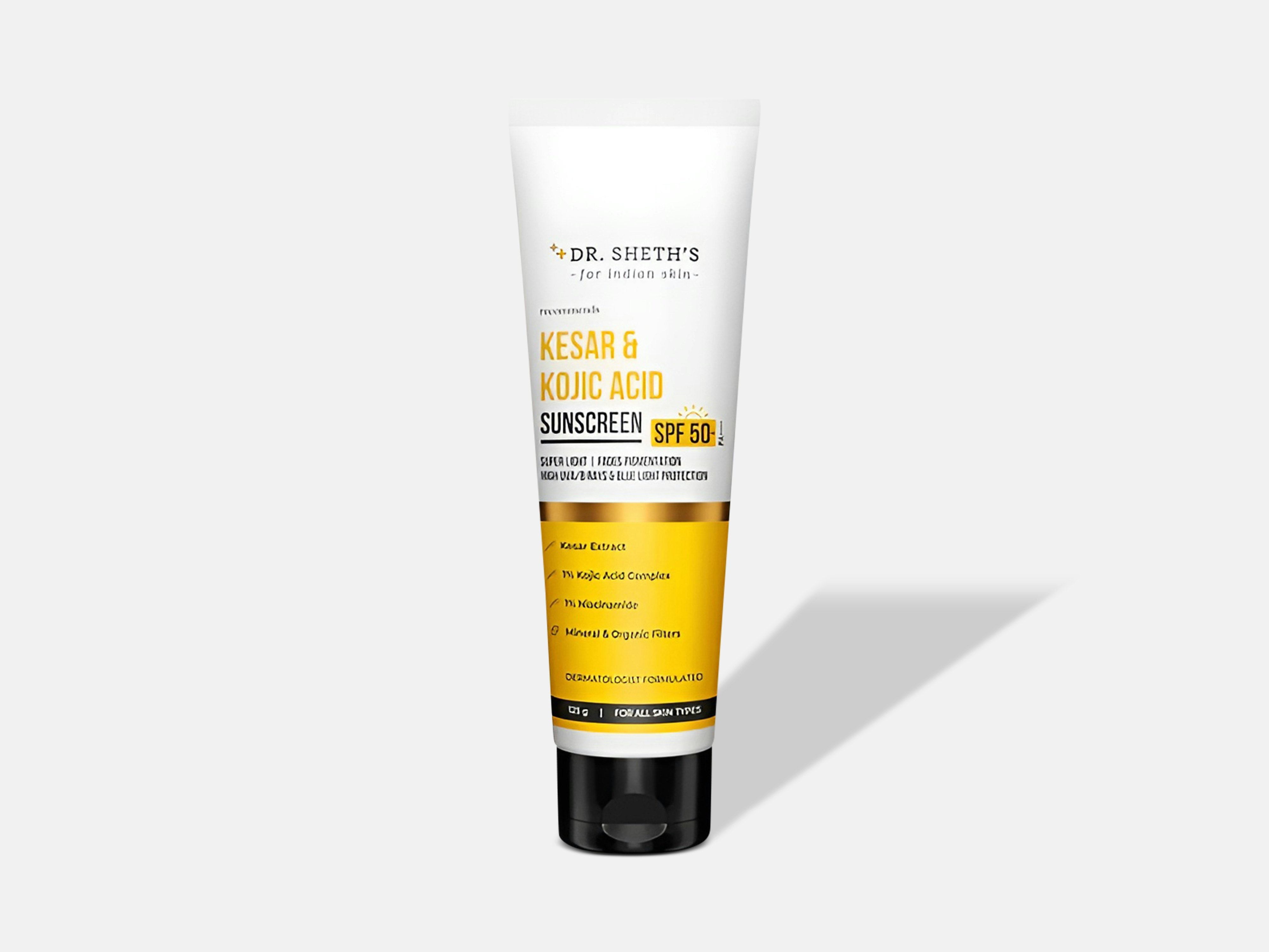 A brightening, protective sunscreen that does more than just shield. Powered with kesar and kojic acid, it helps visibly fade dark spots and boost radiance while offering high UVA/UVB protection. The lightweight texture blends seamlessly without white cast, making it perfect for daily use if you want sun protection and brighter, more even-toned skin. Apply generously as the last step of your routine before sun exposure. Spread evenly over your face and neck, and let it absorb completely. Reapply every 2–3 hours when outdoors for optimal protection.