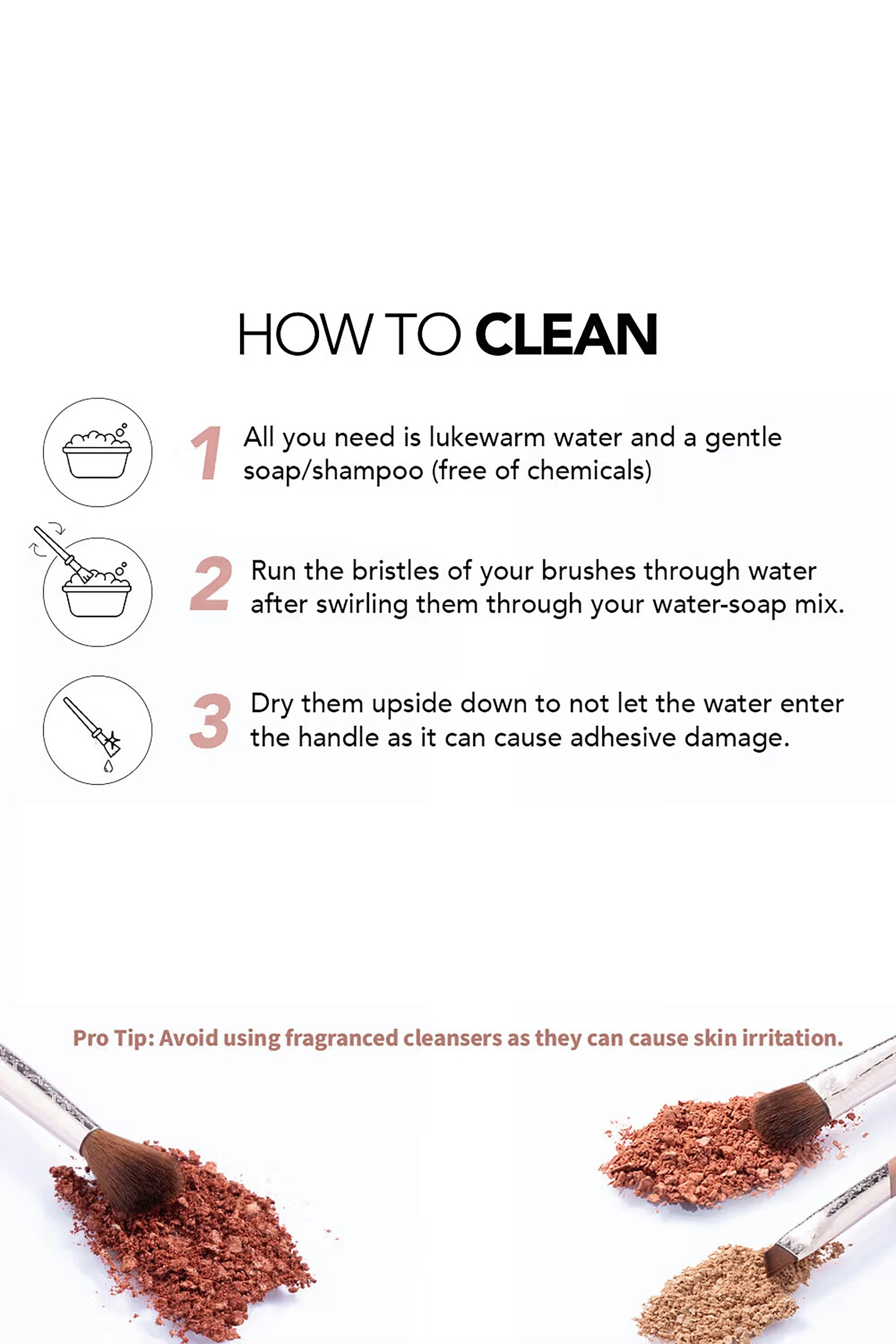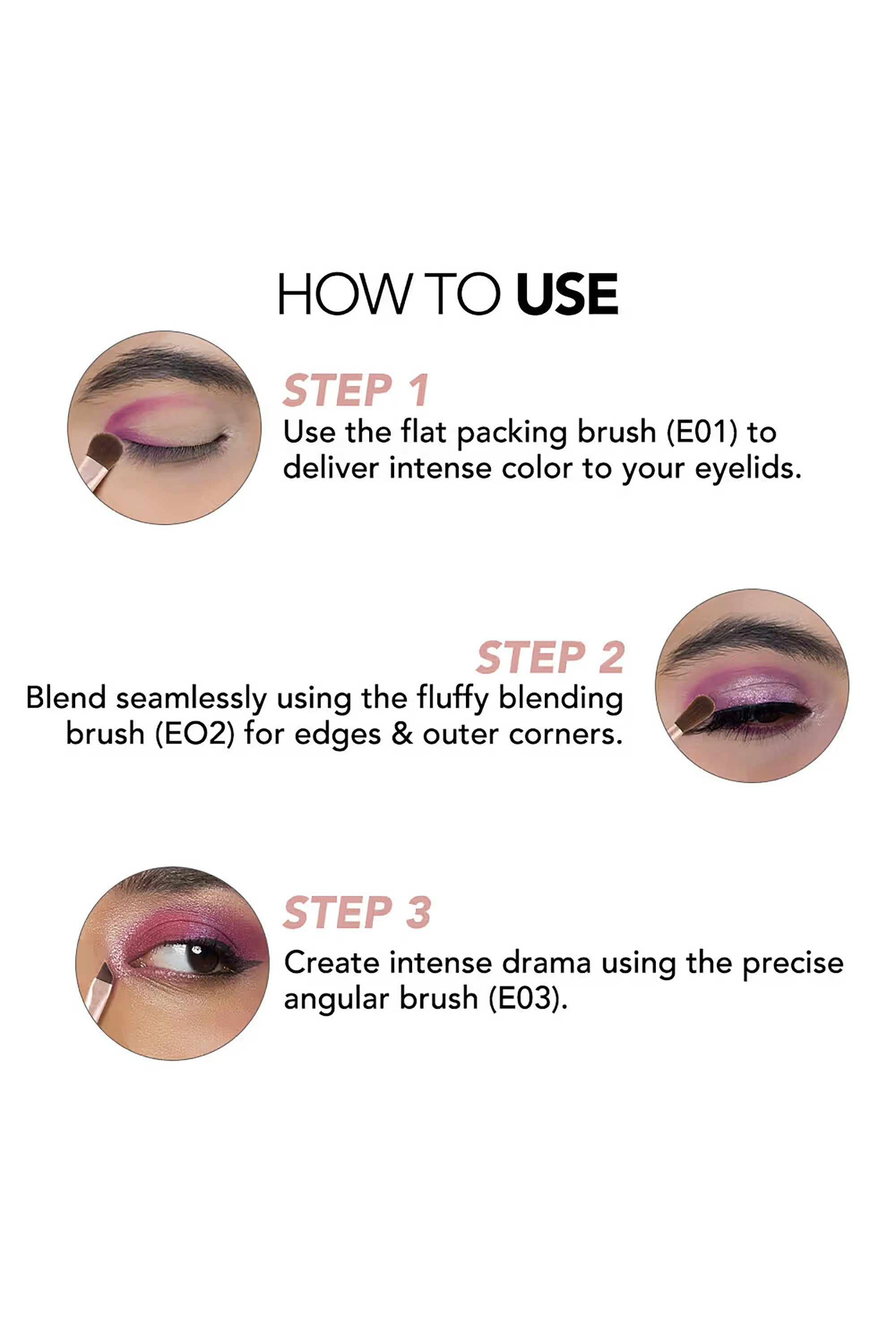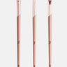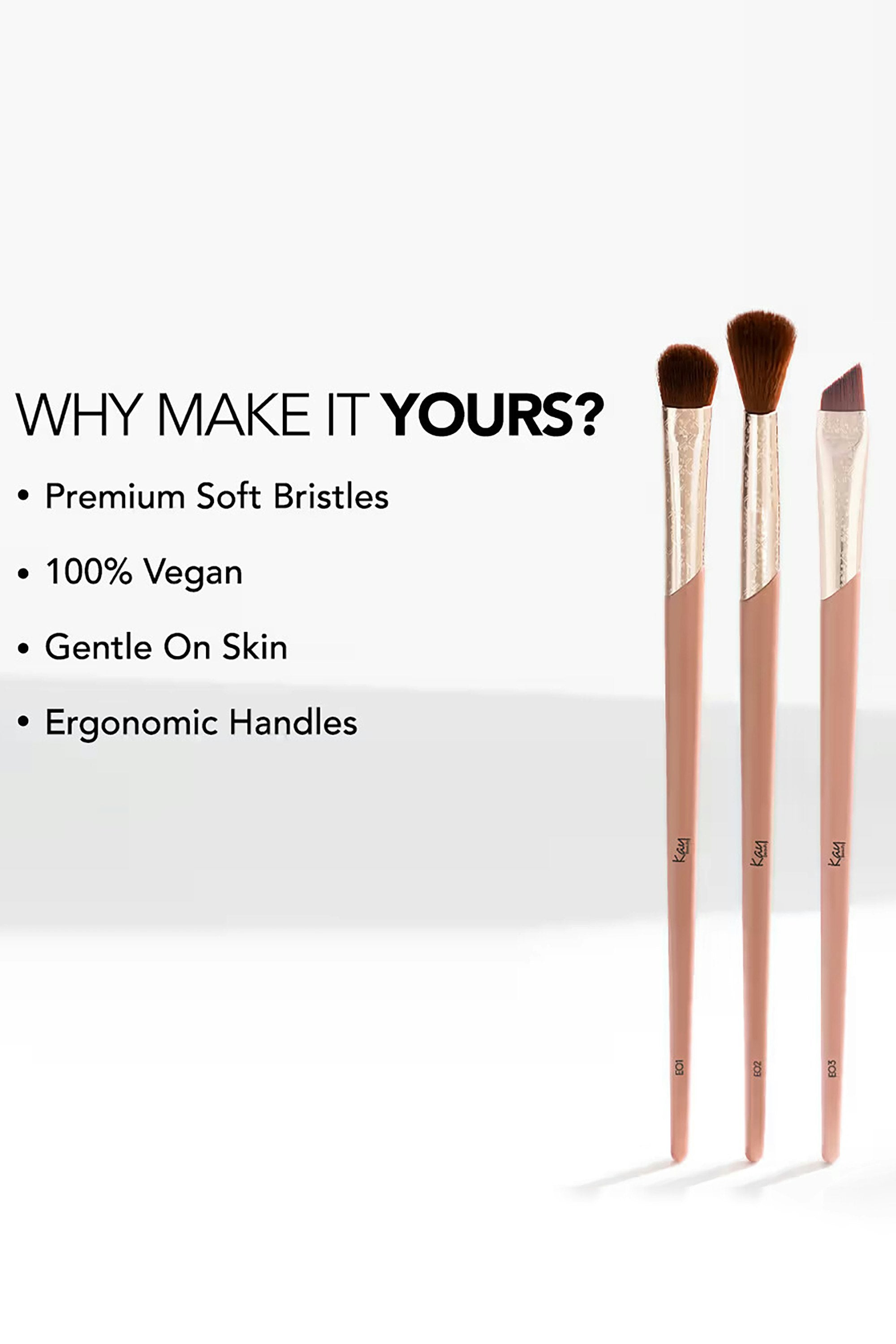 This 3-piece brush set is your eye makeup's new BFF. From blending to detailing, these brushes handle it all with precision and flair. Fluffy, firm, and vegan-friendly, they glide over lids like a dream, leaving zero fallout. Perfect for creating looks that range from subtle to sultry. Your eye makeup just found its soulmate. Use the flat brush to apply the eyeshadow, blend it with the fluffy brush and use the angled brush to add defination along the crease or lower lash line.