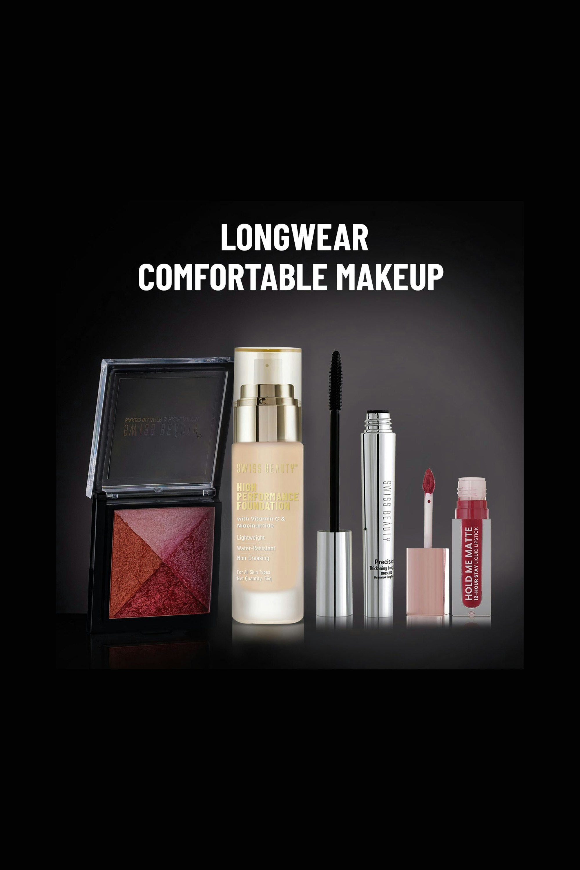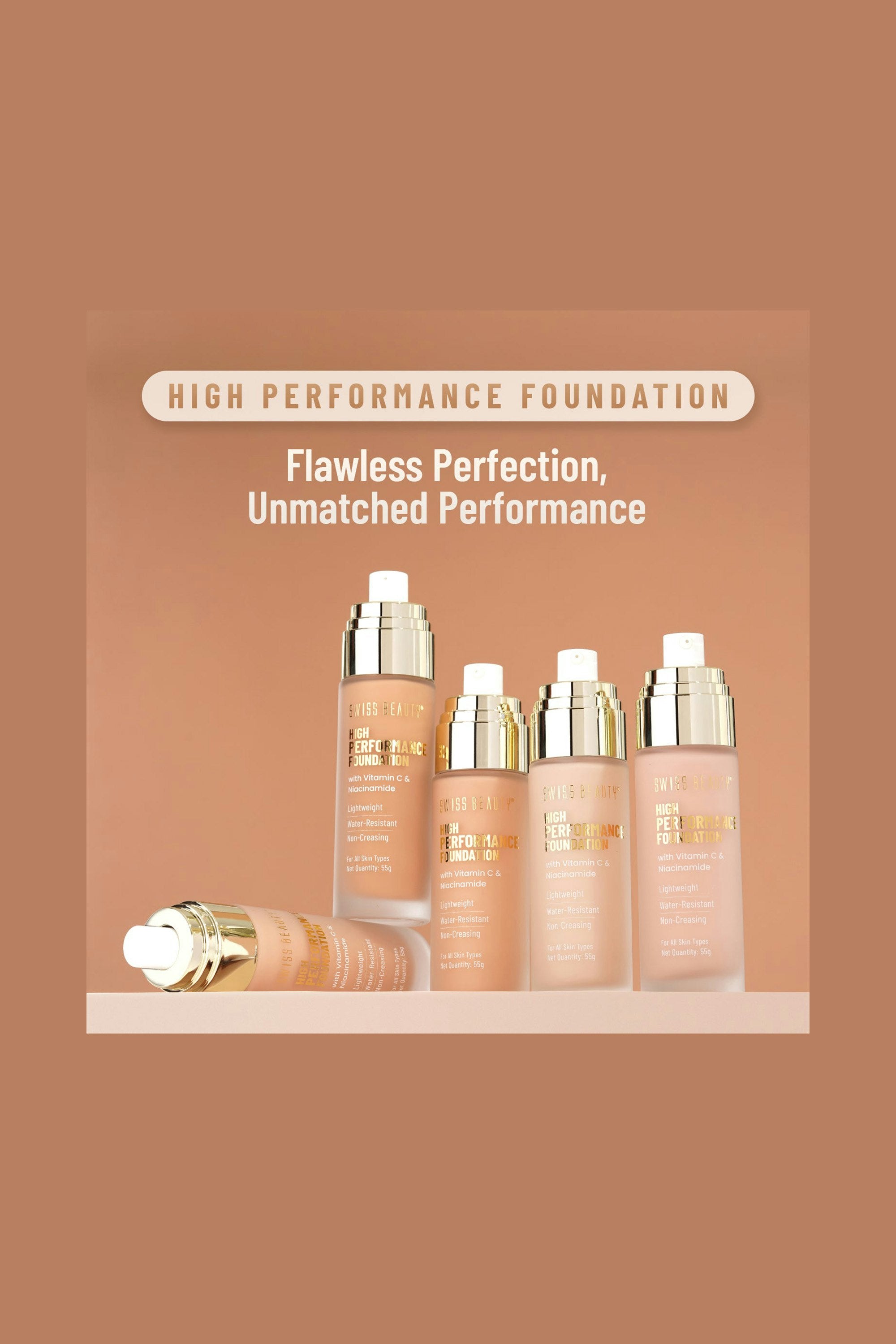 Meet Swiss Beauty High Performance Foundation – your go-to for that smooth, poreless base. With Vitamin C and Niacinamide, this featherlight, oil-free formula blurs dark spots, evens skin tone, and melts in for a dewy, all-day flawless finish without the cakey feel. Pump, dot on face, and blend with a brush for seamless coverage.